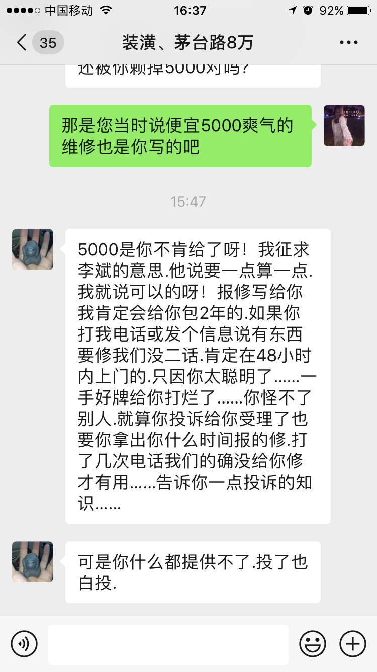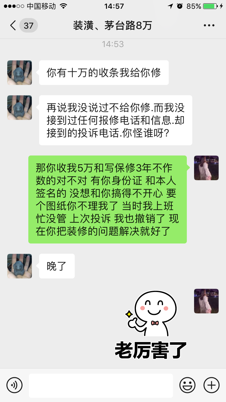 在上海裝潢網(wǎng)監(jiān)督下,督促了裝飾公司才和我們解決問題,公司老板態(tài)度有緩下來。謝謝裝潢網(wǎng)老師!