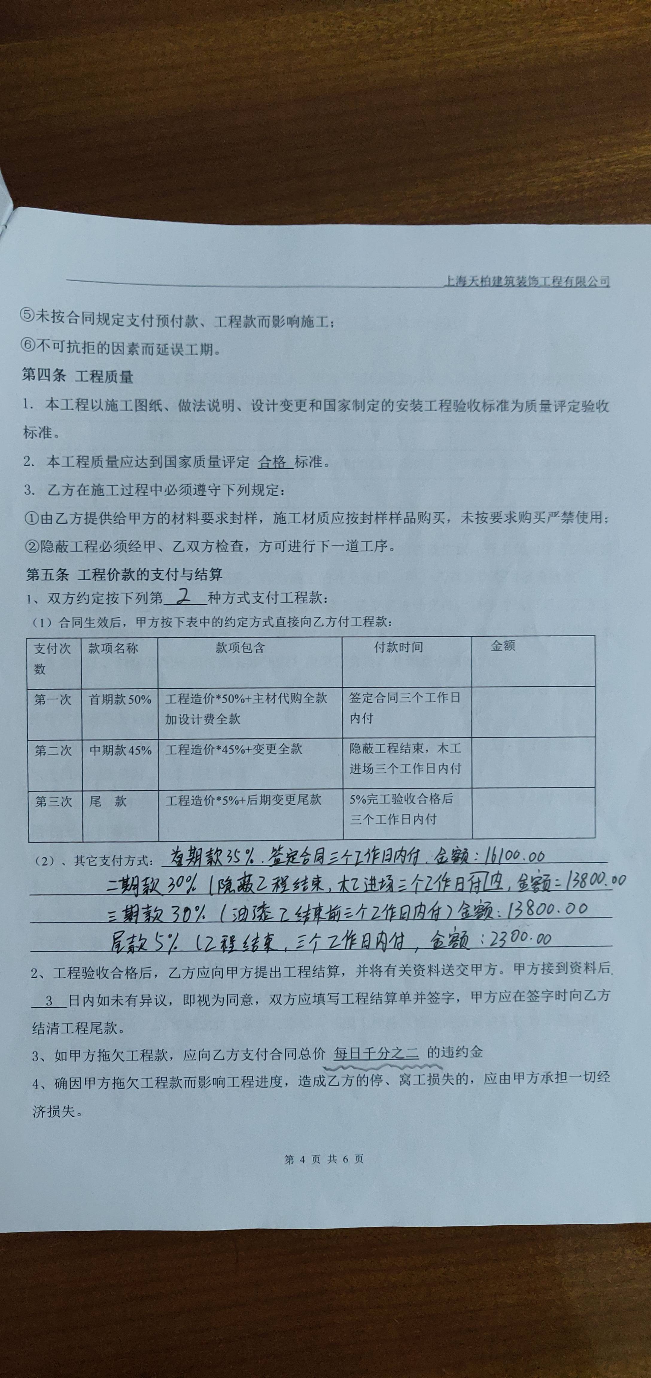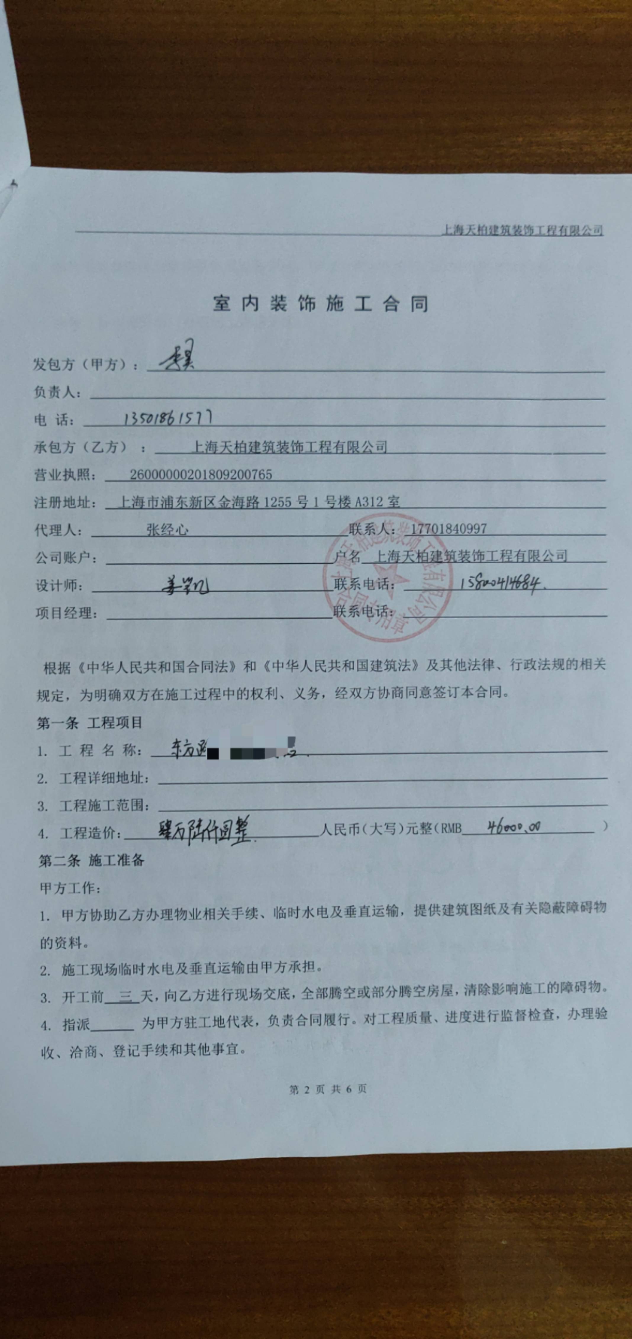 2019年5月初我父親李啟為通過(guò)朋友介紹與上海天柏建筑裝飾工程有限公司接觸,聯(lián)系裝修浦東東方路88平米的門(mén)店。我與設(shè)計(jì)師姜?jiǎng)P以及裝修負(fù)責(zé)人王明明商定裝修方案后,于2019年5月14日簽訂裝修合同。合同寫(xiě)明此次簡(jiǎn)裝費(fèi)用按設(shè)計(jì)師預(yù)算為46000元,并以實(shí)際工作量計(jì)算最終造價(jià),并由天柏公司支付物業(yè)要求的裝修監(jiān)管費(fèi)。事先我已向姜?jiǎng)P、王明明要求裝修工程盡快完工,可是簽訂合同后三天現(xiàn)場(chǎng)無(wú)任何人員到場(chǎng)施工,正式動(dòng)工是5月18日,且自始至終施工現(xiàn)場(chǎng)僅有裝修工人汪先留一人施工,負(fù)責(zé)人王明明并未在現(xiàn)場(chǎng)起到監(jiān)工作用。我曾多次要求加派人手加快施工進(jìn)度,公司方面沒(méi)有做出任何回應(yīng)。后經(jīng)過(guò)了解,裝修工人汪先留并非天柏公司正式員工,僅僅是與公司有過(guò)合作關(guān)系的“熟人”。在施工過(guò)程中由于實(shí)際需求以及縮短工期原因,我與姜?jiǎng)P、汪先留商定刪減了包括吧臺(tái)、地面等多個(gè)施工項(xiàng)目,因此實(shí)際工作量遠(yuǎn)小于合同約定造價(jià)動(dòng)工沒(méi)幾天公司便多次催促我支付施工款,因?yàn)橛泻贤s定,我于5月21日、25日先后兩次各轉(zhuǎn)賬15000元,總計(jì)30000元工程款通過(guò)支付寶轉(zhuǎn)給天柏公司,準(zhǔn)備完工后確認(rèn)差價(jià)多退少補(bǔ)。施工過(guò)程中與物業(yè)溝通發(fā)現(xiàn),與物業(yè)方面簽訂施工申請(qǐng)書(shū)的是上海驍都建筑工程有限公司,而非天柏公司,我懷疑其中存在貓膩,但想到合同中寫(xiě)明按時(shí)計(jì)算造價(jià),且施工已過(guò)半,便沒(méi)有計(jì)較。