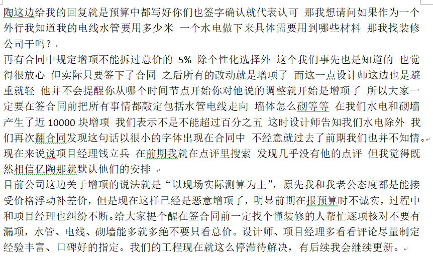五月份開工到現(xiàn)在水電驗收完體驗感極差 無數(shù)坑 我來捋捋被坑的地方 希望能給大家避避坑 擦亮眼睛 謹慎選擇。裝修公司的套路我們在這之前都有所耳聞 也做好增項準備 但是數(shù)額令人瞠目結舌 預算與實際出入巨大 現(xiàn)在設計師和項目經理就咬著一句話“以實際測算為準”來對付我。