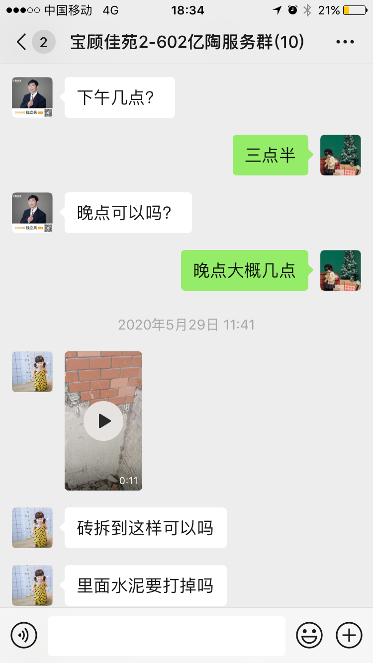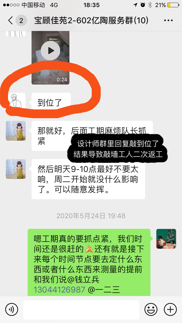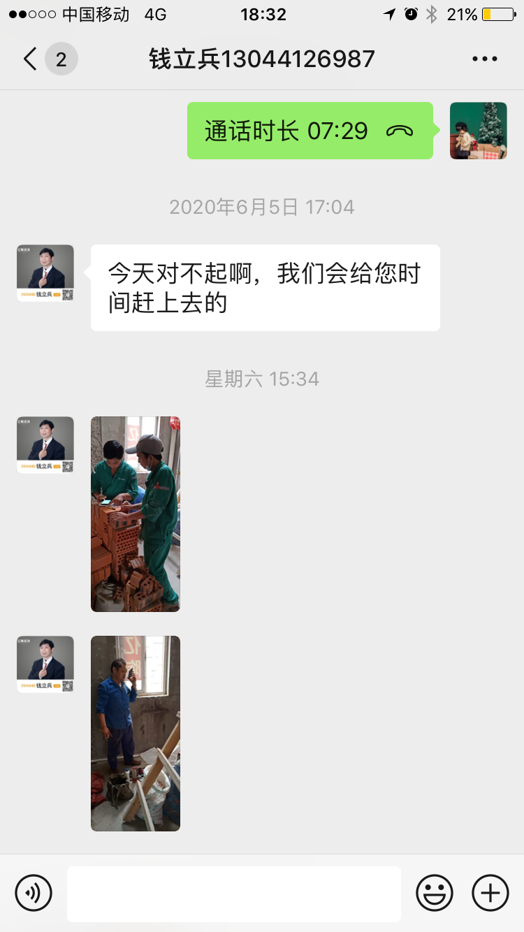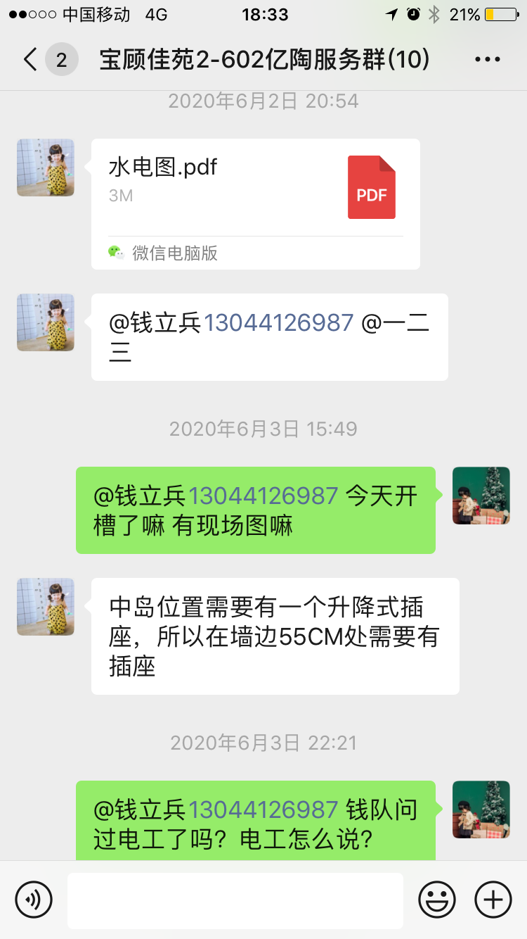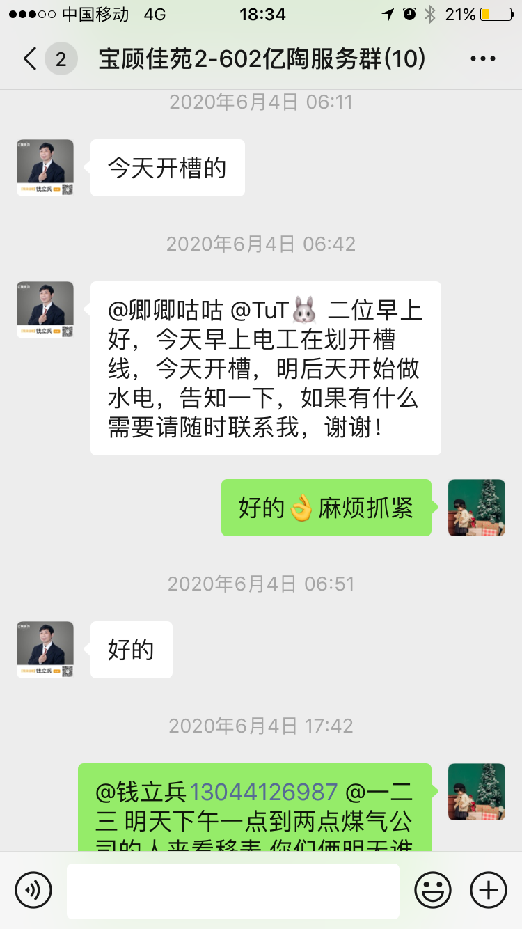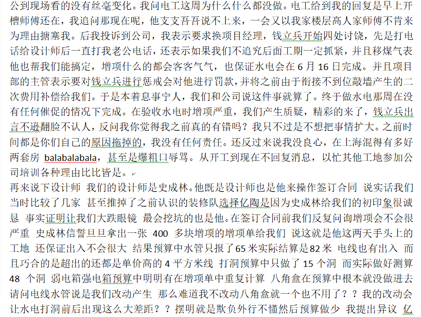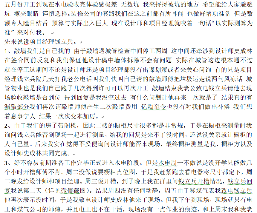 3、好不容易前期準備工作完畢正式進入水電階段。但是水電周一不做說是沒開學只能做幾個小時開槽師傅不肯。周二沒做說要櫥柜點位圖,于是我趕緊跑去看電器將尺寸都定下,周二晚發(fā)給設計師和項目經理。周三說開槽,到了晚上我在群里問錢立兵開槽情況,錢立兵回復我說第二天。結果周四沒有任何動靜,周五由于移煤氣表我致電錢立兵他再次表示沒時間,于是我致電設計師史成林他來了現(xiàn)場。但我下午到現(xiàn)場,現(xiàn)場就只有電工和煤氣公司的師傅,并且電工也不在干活,現(xiàn)場沒有一點作業(yè)的痕跡,和上周末我和我老公到現(xiàn)場看的沒有絲毫變化。我問電工這周為什么什么都沒做。電工給到我的回復是早上開槽師傅還在,我追問那現(xiàn)在呢,他支支吾吾說不上來,一會又以我家樓層高人家?guī)煾挡豢蟻頌槔碛商氯?。后我投訴到公司,我表示要求換項目經理,錢立兵開始四處討?zhàn)?,先是打電話給設計師后一直打我老公電話,還表示如果我們不追究后面工期一定抓緊,并且移煤氣表他也幫我們能搞定,增項什么的都會客氣。