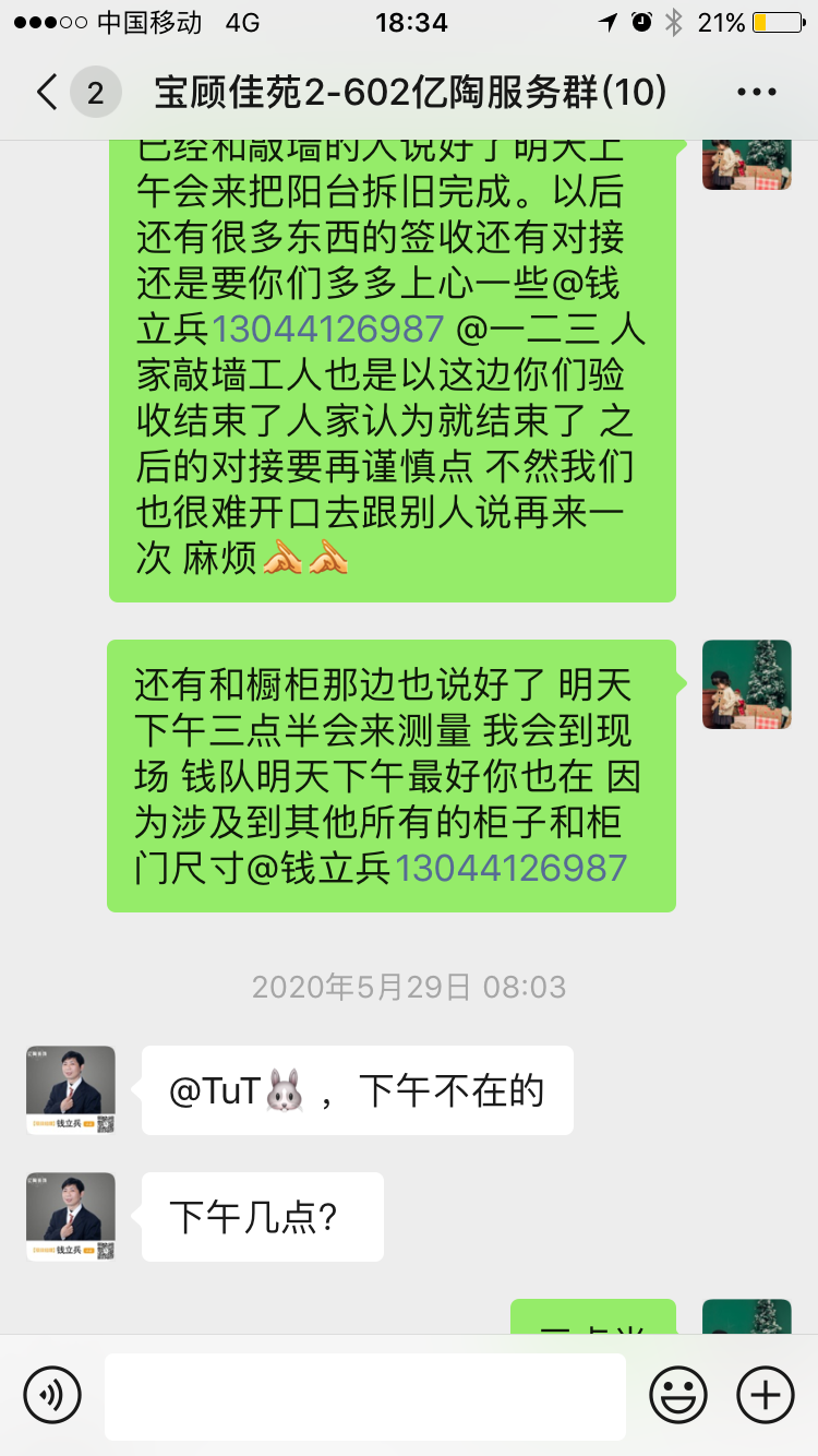 2、由于我們的房子帶閣樓,因此二樓的櫥柜尺寸很多都是非常規(guī),于是在櫥柜來測量時我詢問錢立兵能否到現(xiàn)場一起進行測量,給我的回復是來不了沒時間,還說沒關系就讓櫥柜的人自己量。后來我實在覺得不妥便詢問設計師能否來現(xiàn)場,最終櫥柜測量是我、櫥柜方以及設計師史成林共同完成。