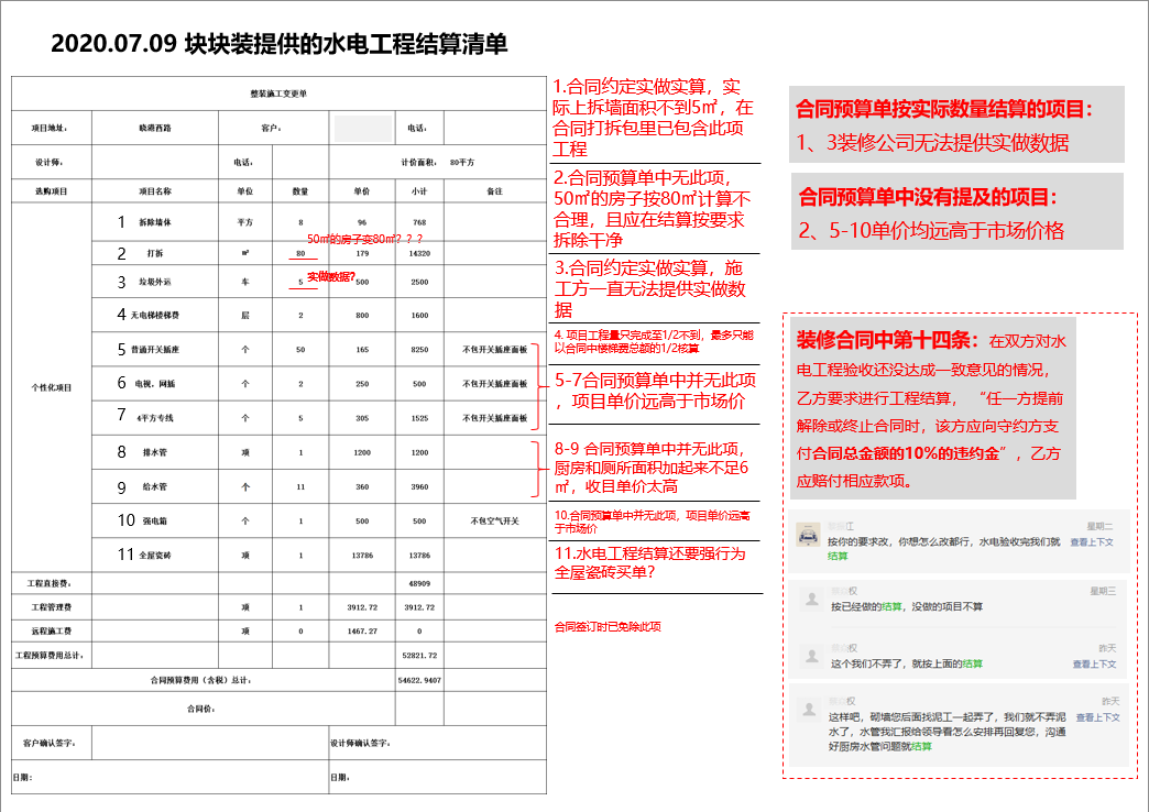 4.只做到水電要求結(jié)算,50平米的房子水電工程(沒(méi)砌墻)結(jié)算費(fèi)用是5.5萬(wàn),多項(xiàng)工程項(xiàng)目費(fèi)用沒(méi)有在合同中體現(xiàn),結(jié)算時(shí)單價(jià)標(biāo)準(zhǔn)明顯過(guò)高,實(shí)做實(shí)算的項(xiàng)目無(wú)法提供實(shí)做數(shù)據(jù)。