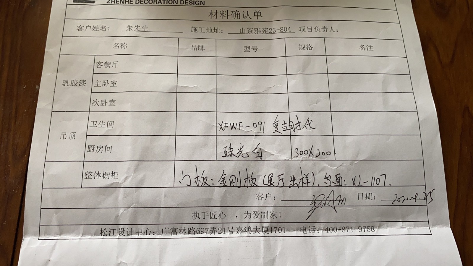 本人與上海臻和裝飾設(shè)計(jì)有限公司(下稱臻和)簽訂房屋裝修合同,在確認(rèn)櫥柜門板顏色時(shí),選擇臻和樣板櫥柜顏色,并簽訂了材料確認(rèn)單(附圖),如圖所示,整體櫥柜欄:金剛板,顏色為展廳出樣。在過(guò)程中,工作人員并未告知實(shí)際顏色與樣板顏色存在明顯色差,也并未拿小樣給我們確認(rèn)。
