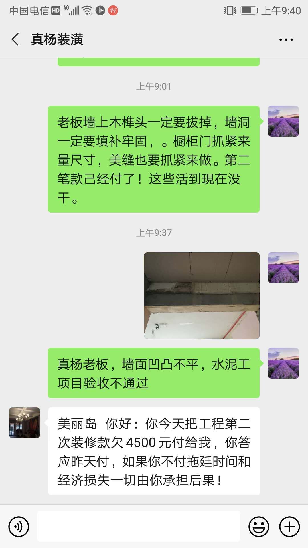 10、真楊公司沒有任何誠信可言,簽合同前所有答應(yīng)的事,包括已明確寫入預(yù)算清單中的要求,在實(shí)際施工過程中抵賴拒不按約定施工,如不能排線安裝三聯(lián)開關(guān)、墻面承諾鏟掉原膩?zhàn)訉?shí)際卻不鏟,把墻面整塊發(fā)霉都留在里面。