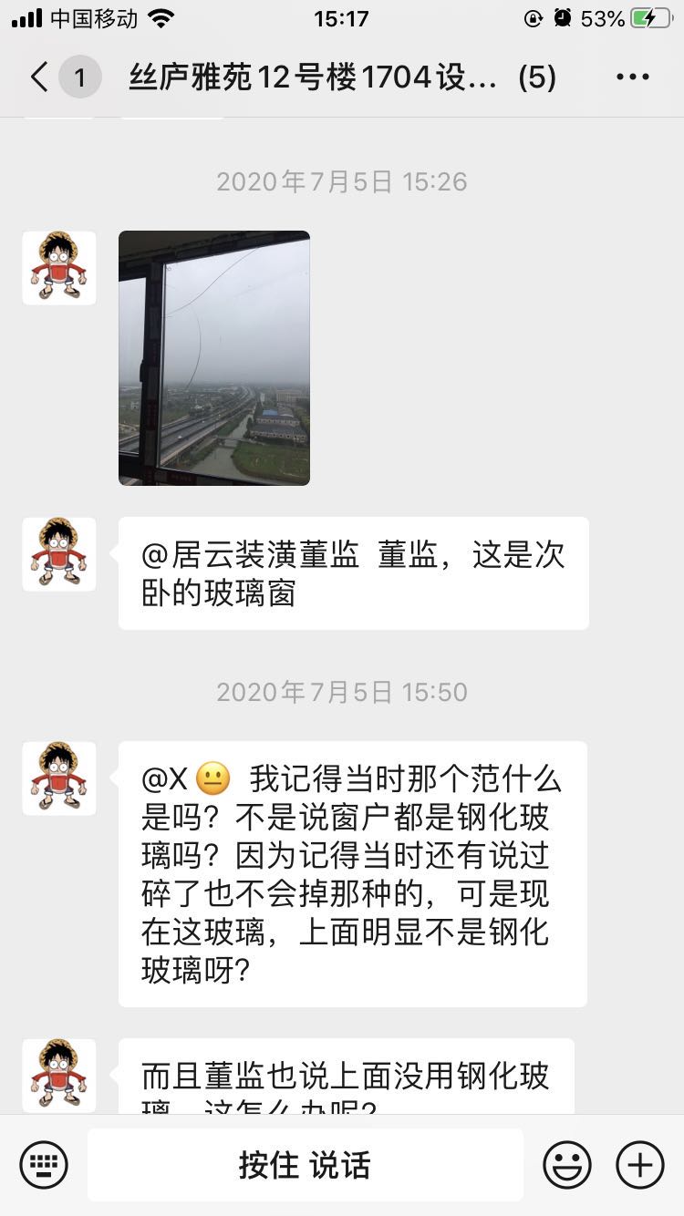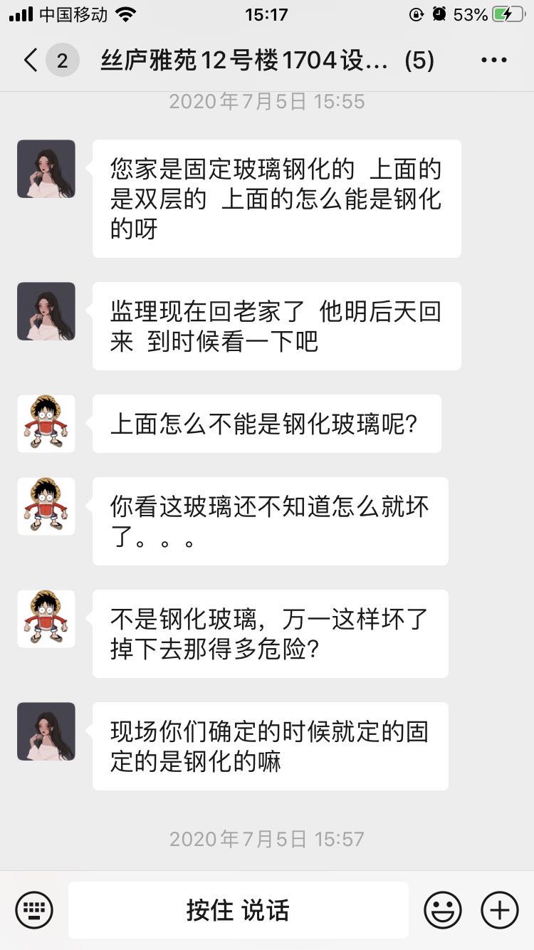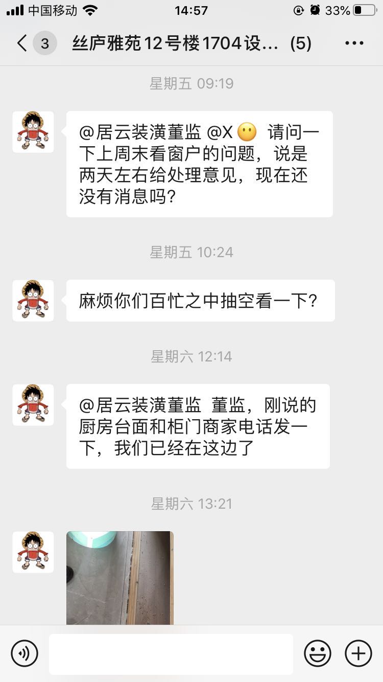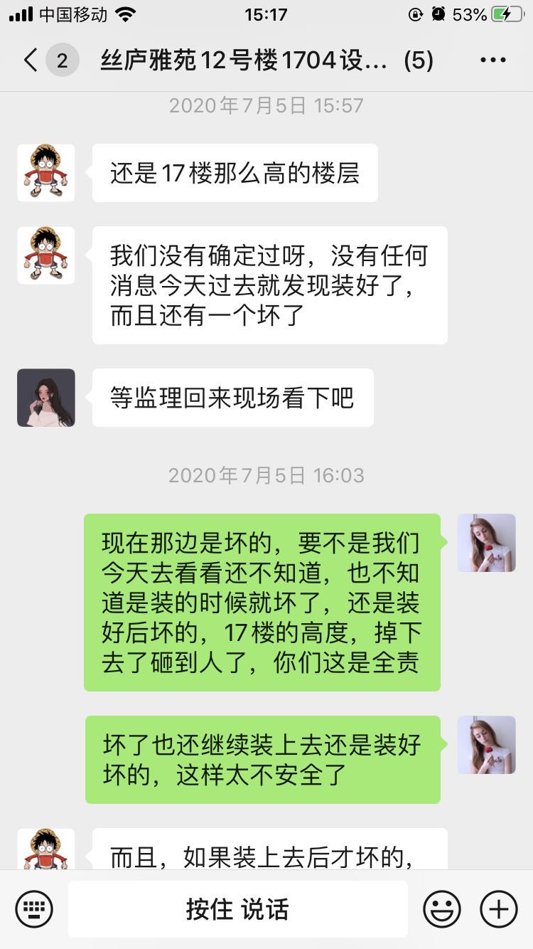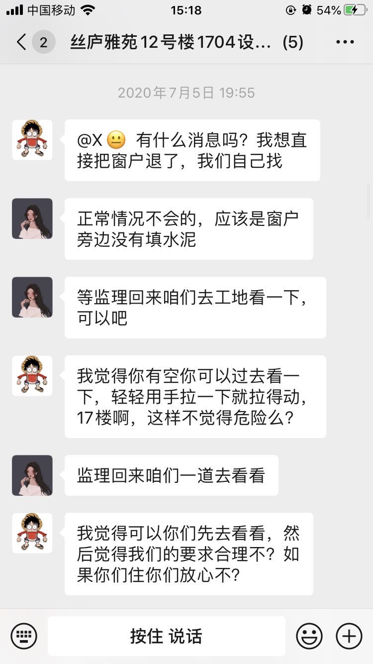 5.裝修方態(tài)度惡劣,一直拖著問題不解決,相互推諉;平時溝通也愛答不理,微信溝通問問題態(tài)度惡劣,經(jīng)常性不回消息(7月5日發(fā)現(xiàn)窗戶的問題,拖到現(xiàn)在仍未處理,后期可能還耽誤工期)