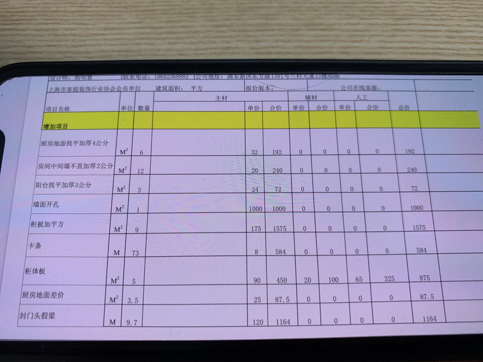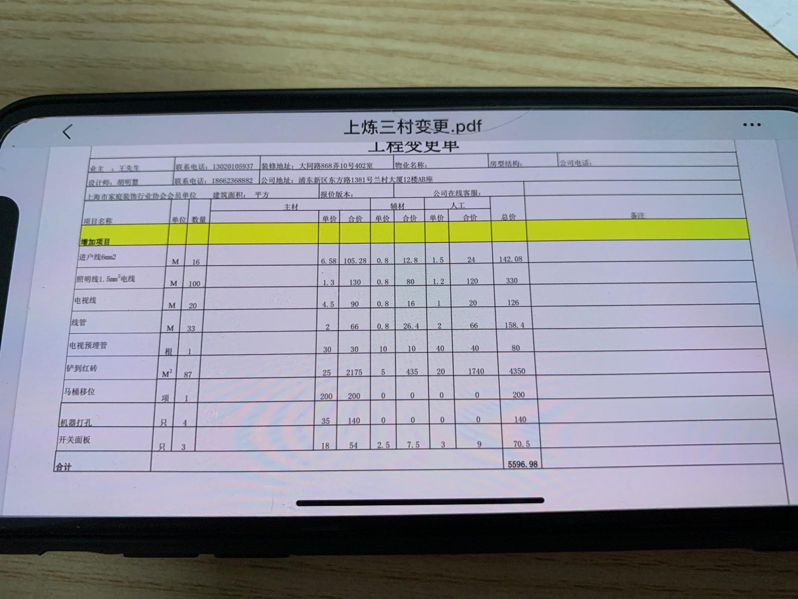 4.私自增加門套打底,增加的衣柜材料事先未告知,沒找人確認,也未告知價格。家里的一張餐桌,未經(jīng)同意私自拿走,事后告訴我說是當垃圾扔掉。馬桶移位200(僅使用20cm長一個塑料管),陰陽角條20一根等,懷疑材料費虛高。