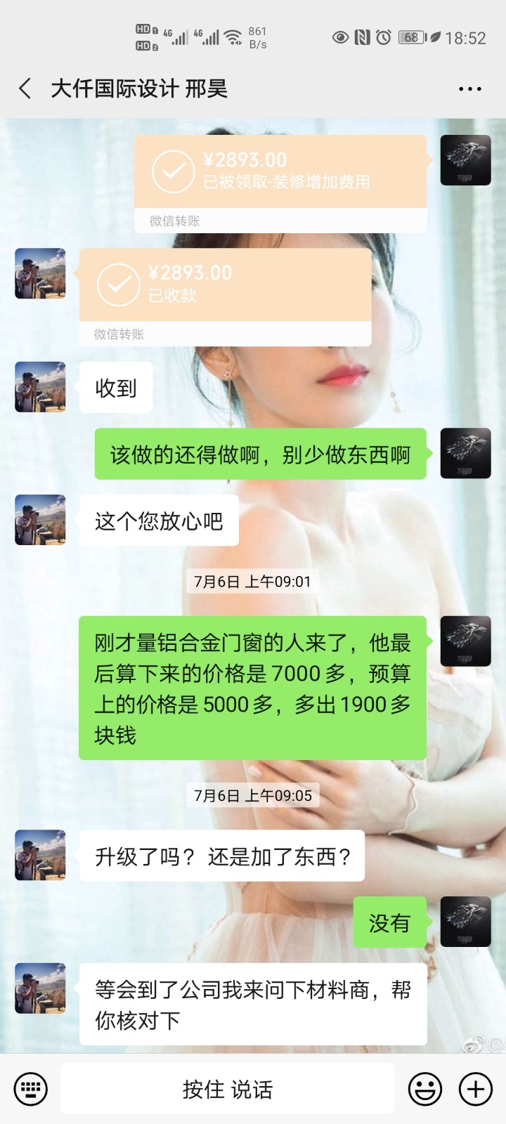 這才剛剛開始,各種增項費(fèi)用已經(jīng)超過一萬元,后續(xù)不知道還要增加多少項目多少費(fèi)用,全包變成了不包,讓我十分頭疼。因此我拒絕了之后的增項費(fèi)用,裝修公司立馬停工。停工之后,我去大仟公司和設(shè)計師協(xié)商,要求按合同施工。設(shè)計師邢昊態(tài)度十分惡劣,提出重新量房,增加費(fèi)用。這明顯違反合同,我拒絕了,雙方未能達(dá)成一致。