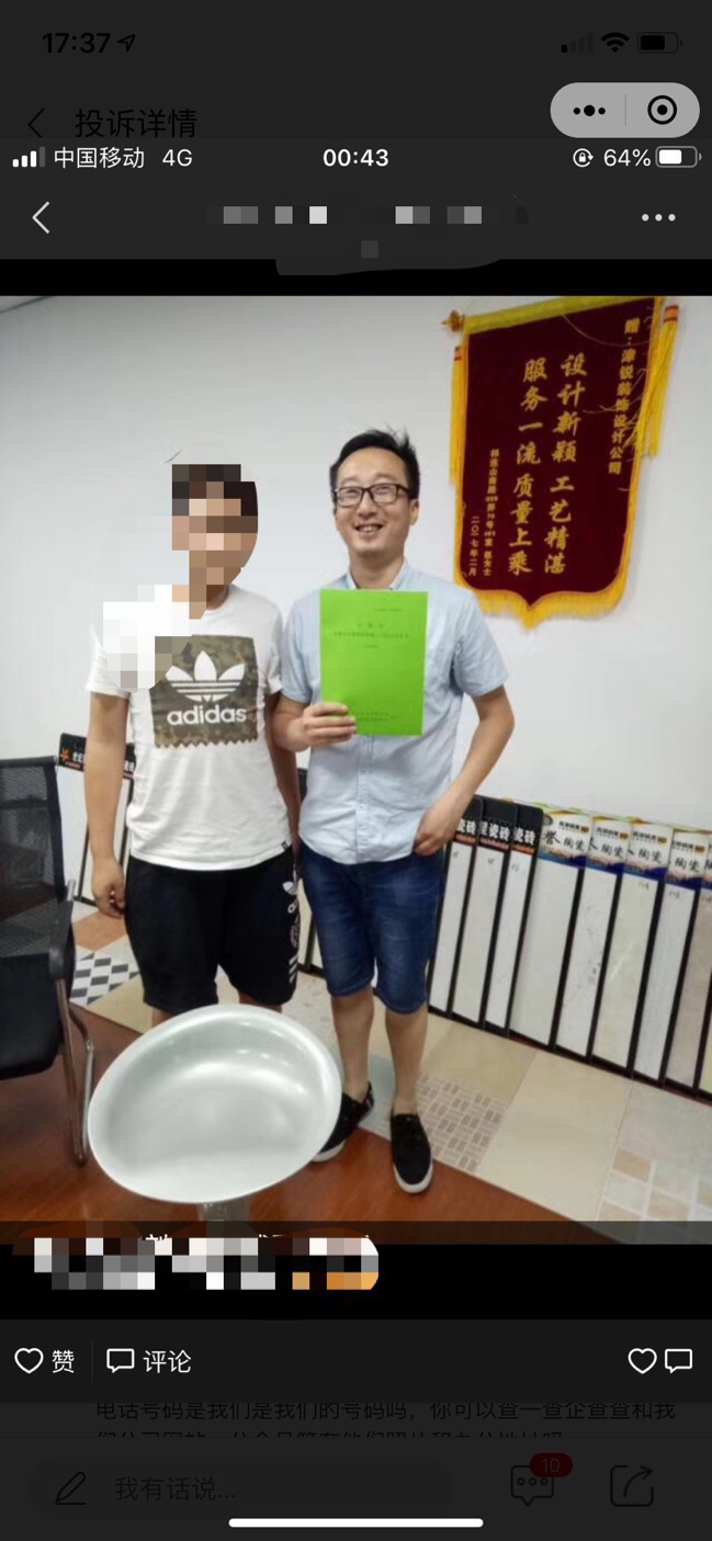 | 裝修面積 | 45m2 | 投訴人手機 | 1582192**** | 被投訴人手機 | 1358550**** |