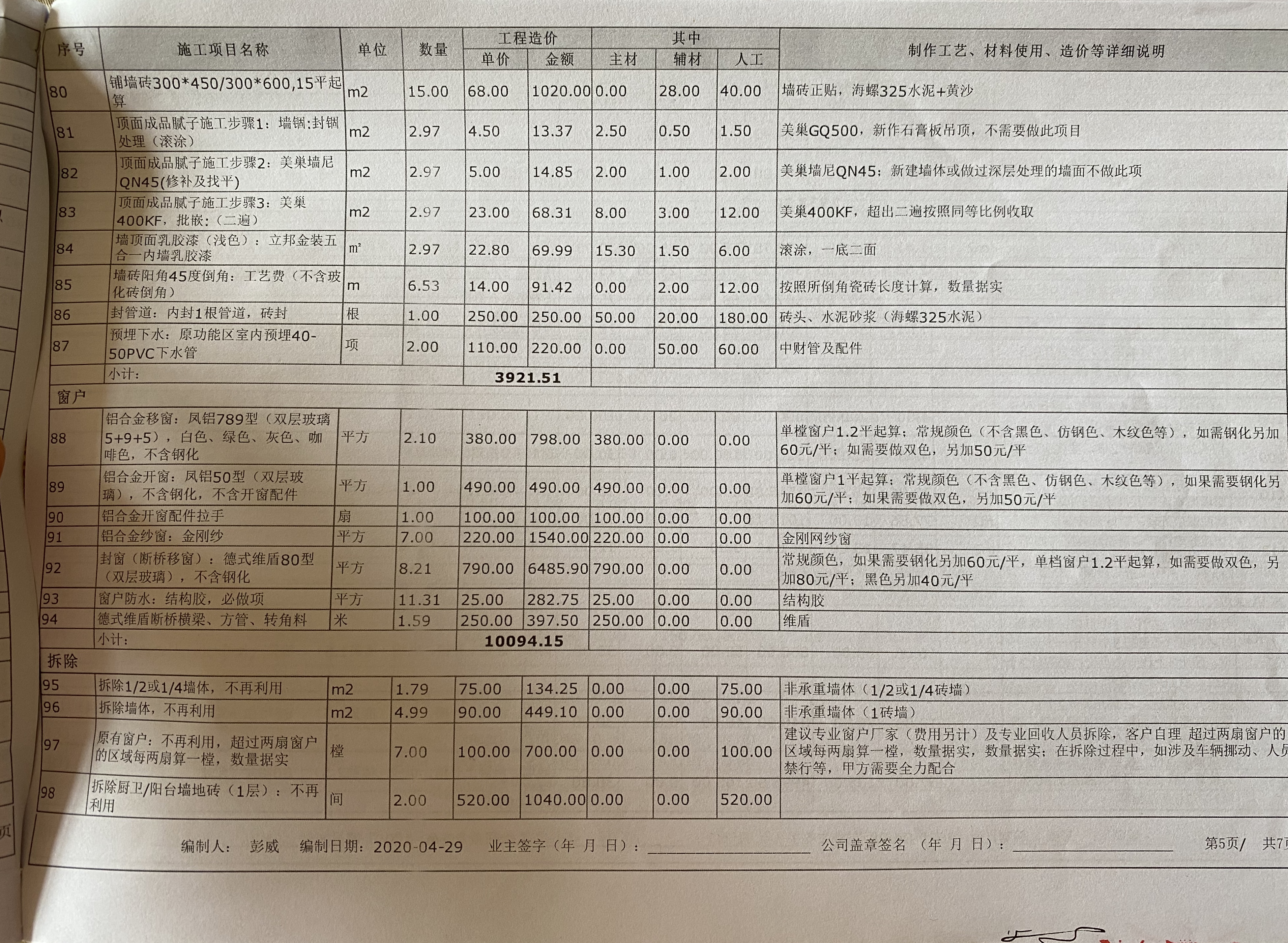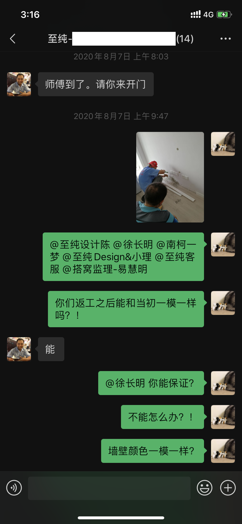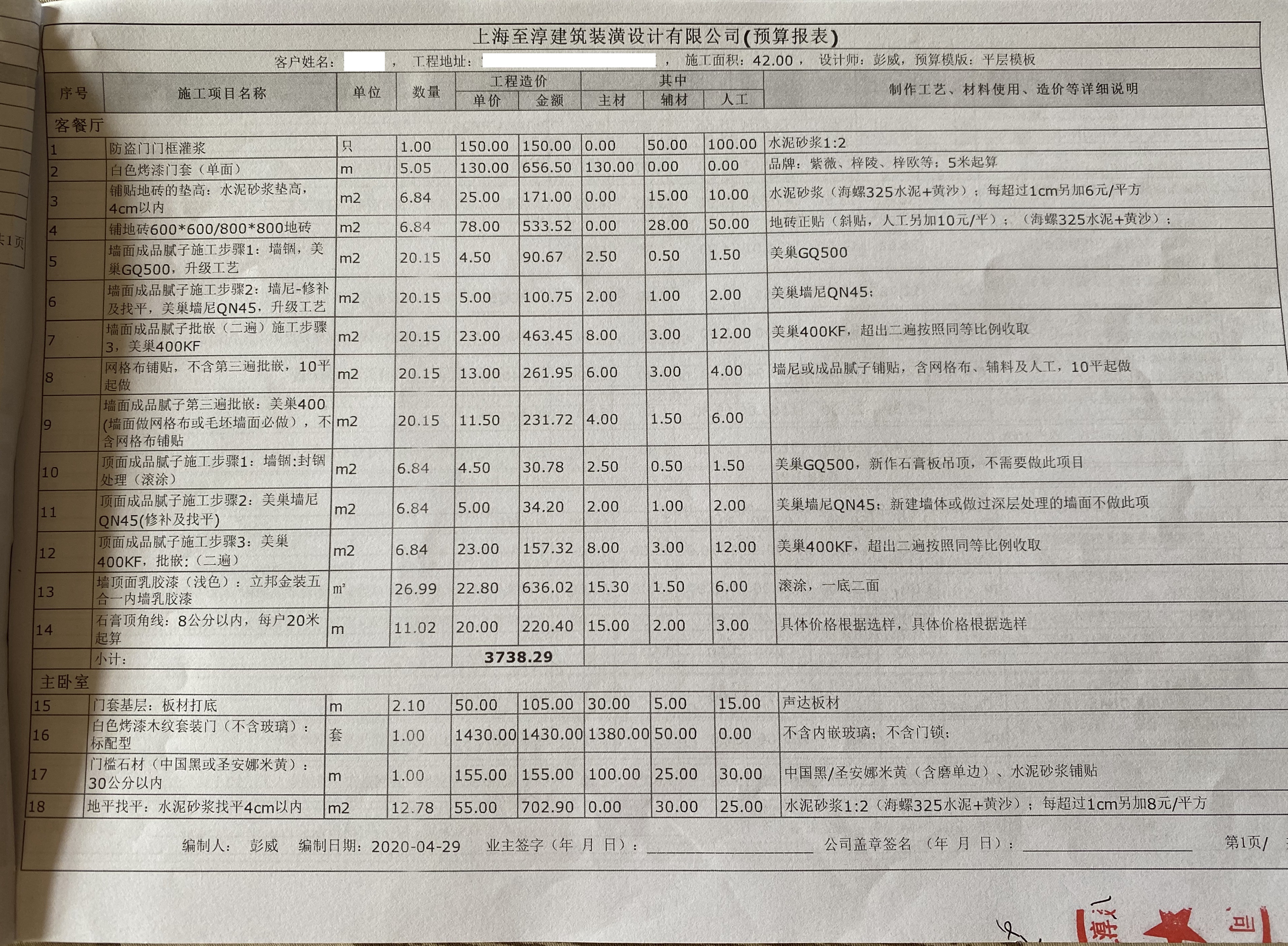 2020年5月初-8月初,由該司委派的設(shè)計師彭威和包工頭徐長明對我家進(jìn)行半包裝修。