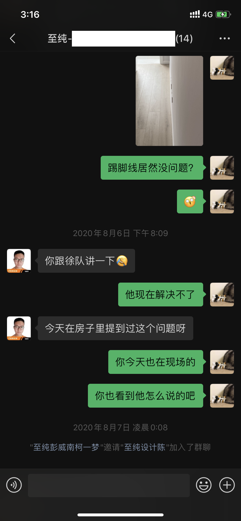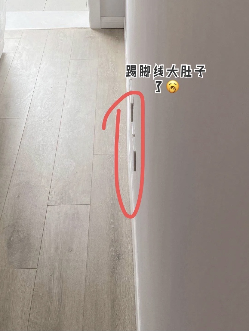 2、主臥踢腳線凸出來的,被包工頭返工之后,墻刷的一塊一塊顏色,非常明顯,還非常難看,天天看到很窩火。