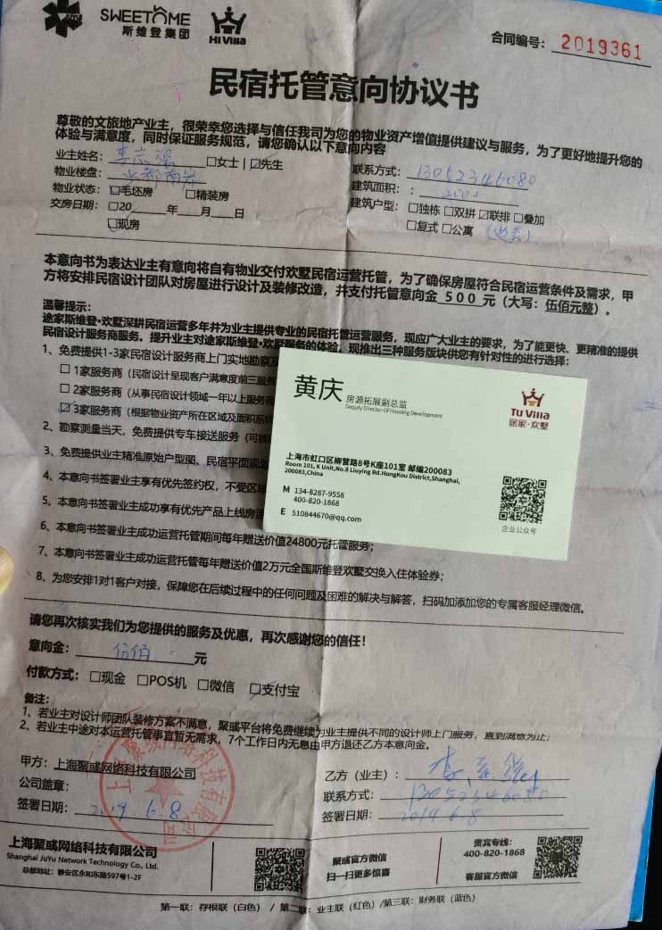 我于2019年6月8日于思維登旗下的民宿代理公司“上海聚彧網(wǎng)絡(luò)科技有限公司”簽訂協(xié)議,并且支付意向金500元。但是因?yàn)闋砍兜胶笃诰S護(hù)問題,必須在指定裝修公司裝修。后推薦“上海浩碩建筑工程有限公司”為我裝修。在平面圖沒有確定的情況下,我于3月30日付款15000元設(shè)計(jì)費(fèi),3000元裝修抵扣金。因?yàn)檠b修公司說只有付了定金才能出具體設(shè)計(jì)稿。然而到8月4日每次仍然糊弄設(shè)計(jì)稿,說很忙沒時(shí)間做。這是我聯(lián)系“上海聚彧網(wǎng)絡(luò)科技有限公司”的銷售人員,已經(jīng)沒了蹤影。我找到裝修公司,她們說可以找途家其他的代理公司繼續(xù)服務(wù)。這是我才知道代理公司已經(jīng)不做了,然而裝修公司并沒有及時(shí)告知,而且收取了我的裝修費(fèi)用,一直在拖時(shí)間。