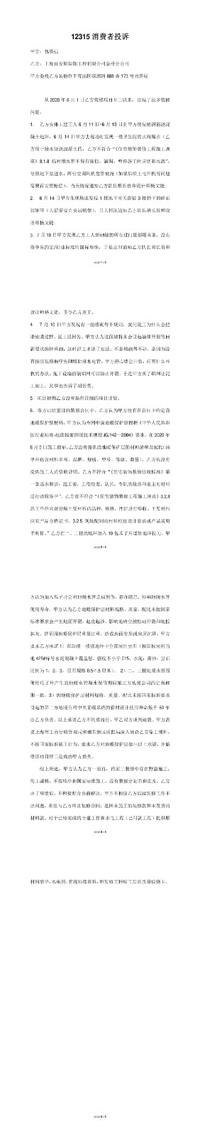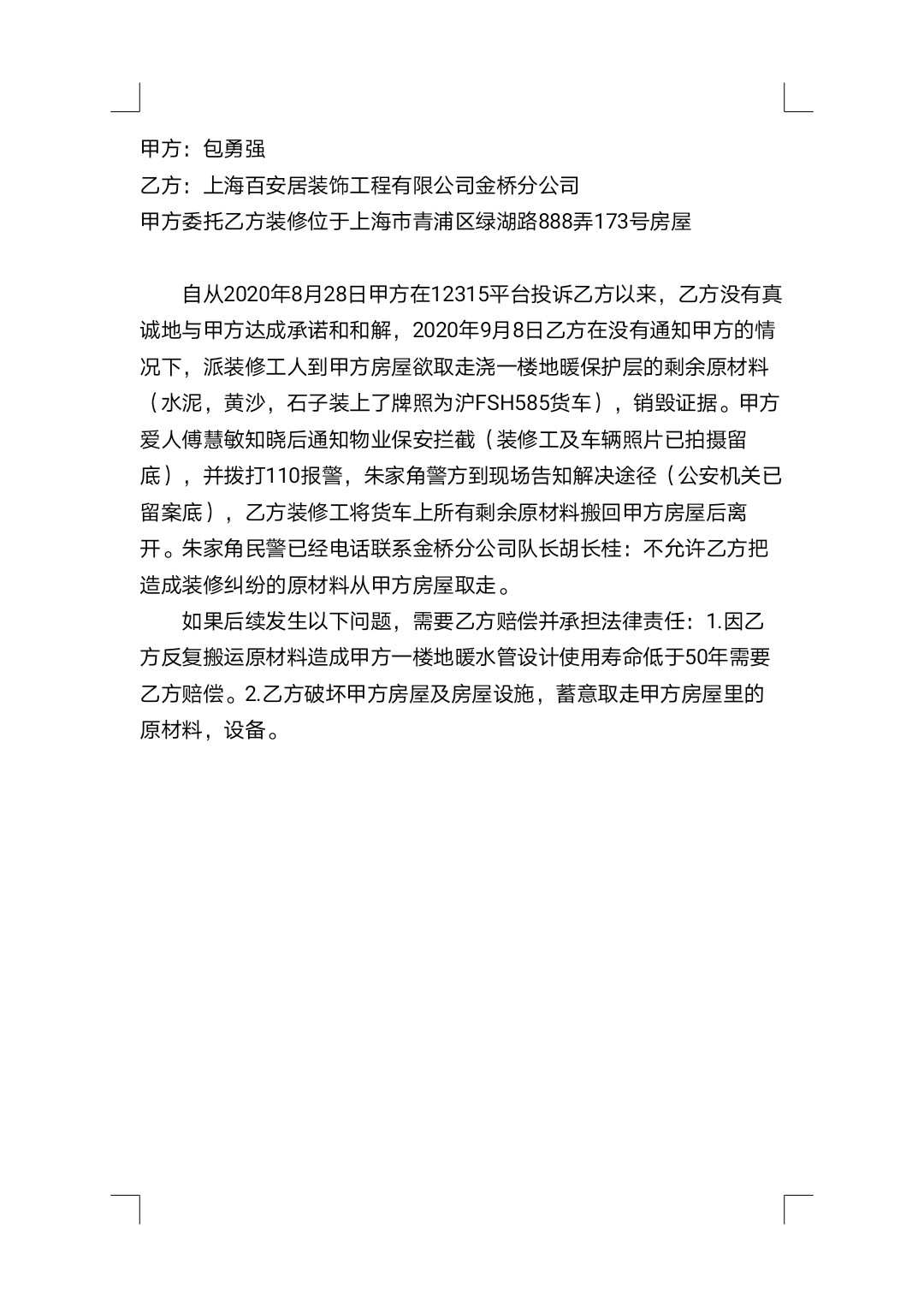 具體投訴內(nèi)容見(jiàn)附件,從2020年8月28日12315申訴以來(lái),百安居造成的裝修質(zhì)量問(wèn)題沒(méi)有得到解決,2020年9月8日乙方未通知甲方,到甲方房屋取澆地暖保護(hù)層剩余原材料,銷(xiāo)毀證據(jù)(該行為已經(jīng)報(bào)警)。希望上海裝修裝飾行業(yè)協(xié)會(huì)協(xié)同解決。