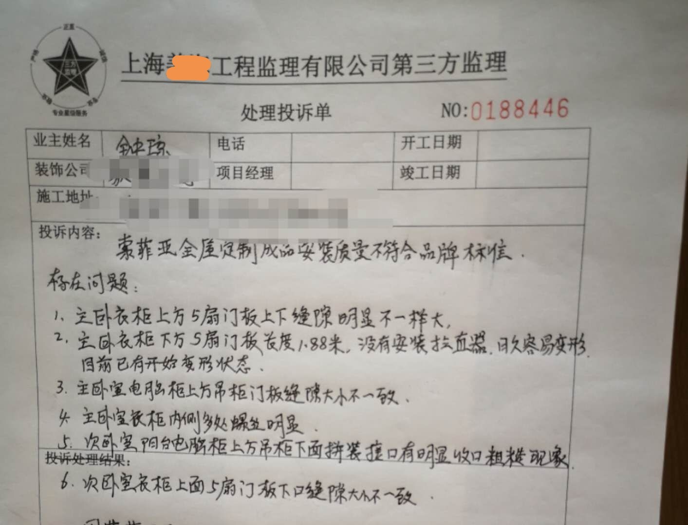 | 投訴類型 | 施工質量 | 投訴人 | 鐘** | 被投訴單位 | 上海司索家居有限公司 |