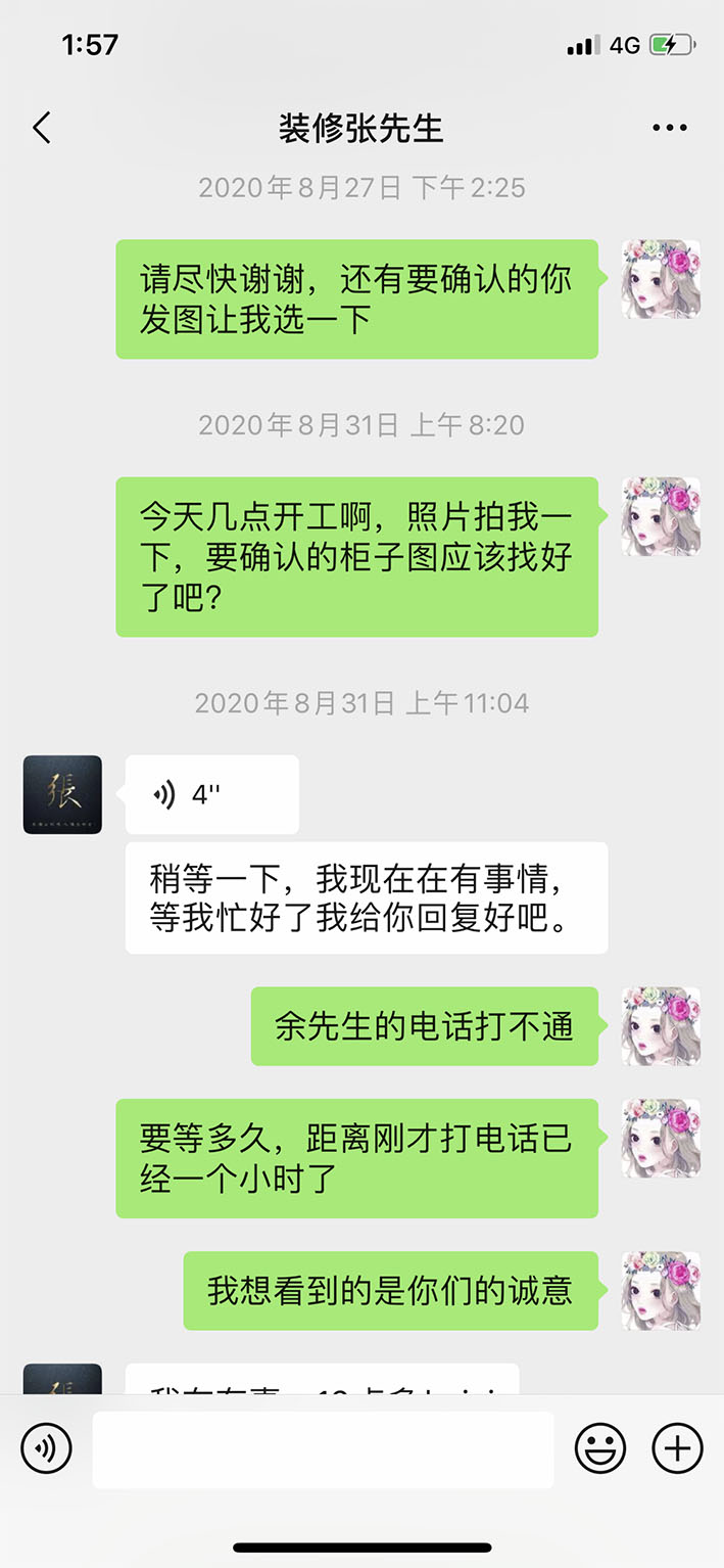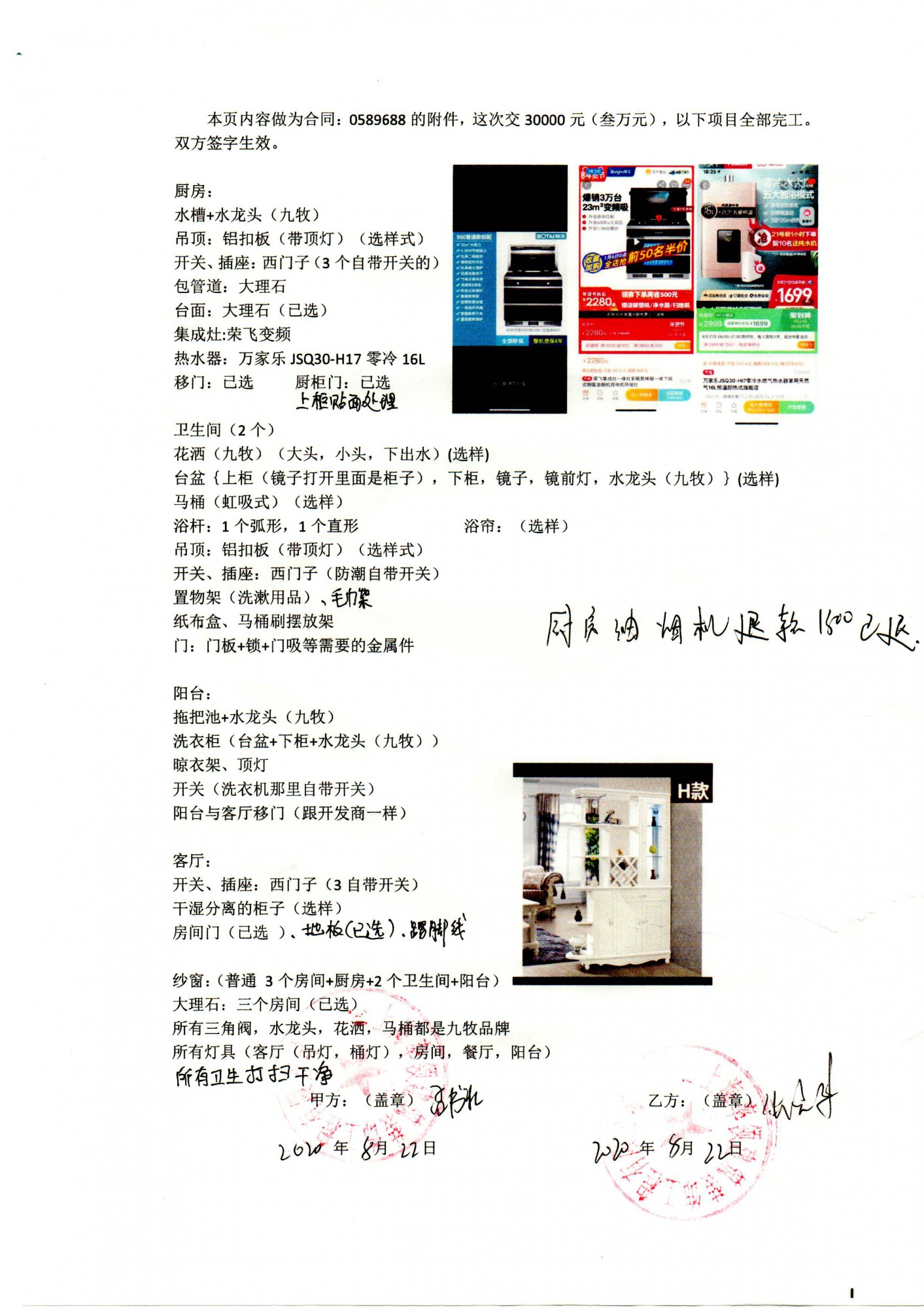 8月22日,我找他們協(xié)商,簽了個(gè)補(bǔ)充協(xié)議,答應(yīng)給他們第三筆款三萬(wàn)元。他們提出集成灶跟他們報(bào)價(jià)有出入讓我自己買(mǎi),所以這個(gè)集成灶的錢(qián)就扣除了。實(shí)際付給他們兩萬(wàn)八千二。要求他們盡快開(kāi)工干活,張家來(lái)(業(yè)務(wù))答應(yīng)我20天左右完工。說(shuō)是過(guò)兩天就開(kāi)工干活,我催了八天,他們答應(yīng)我星期一(8月31日)開(kāi)工。星期一我打他電話,他就一直不接我電話,后來(lái)回個(gè)短信給我,讓我找余小猴,余小猴就讓他們?cè)O(shè)計(jì)師發(fā)我一個(gè)增加項(xiàng)目。