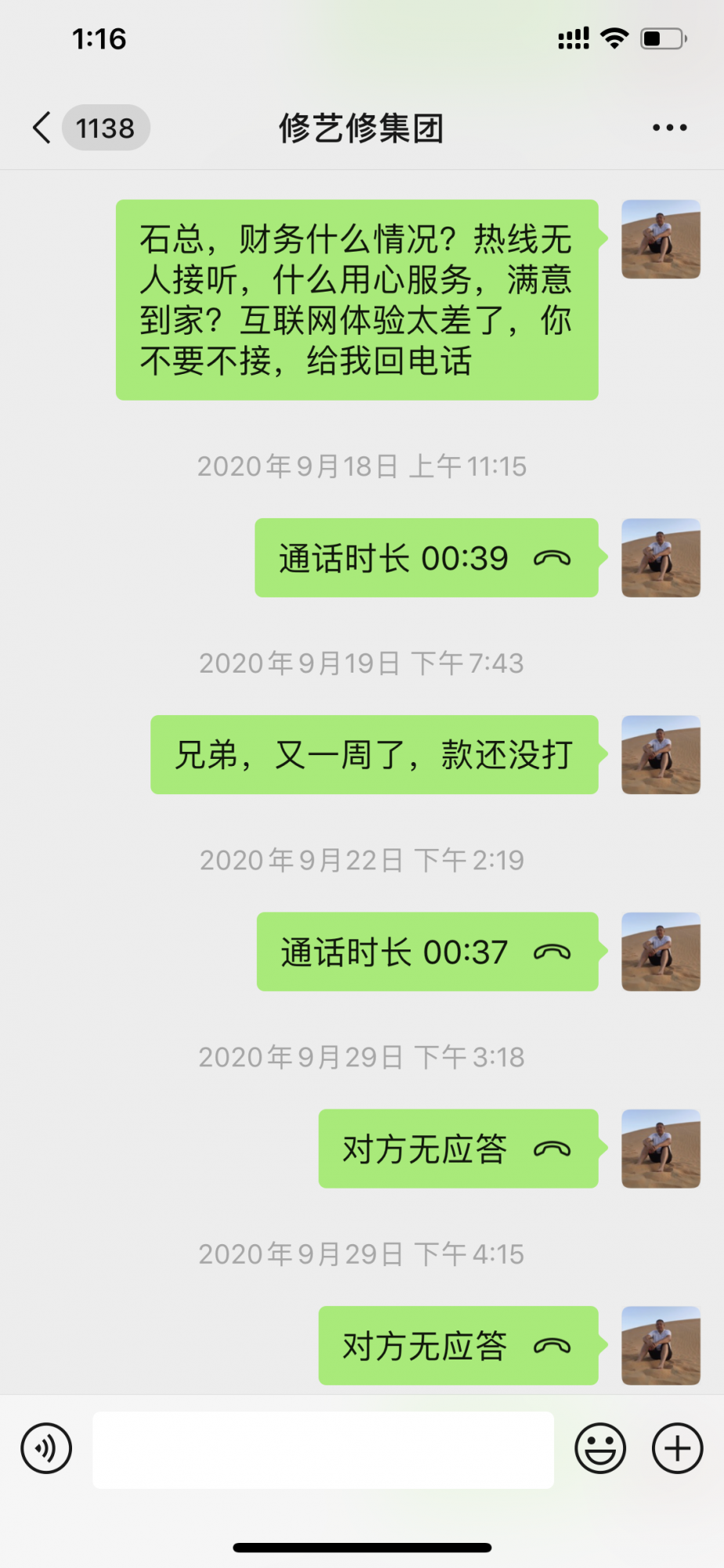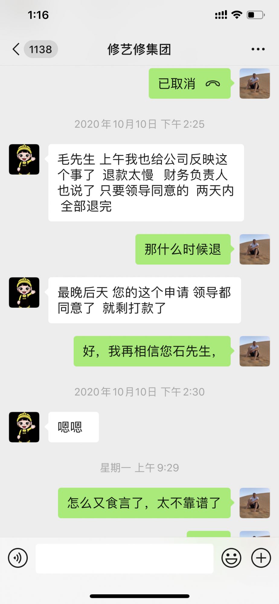 2020年元旦后,發(fā)現(xiàn)繼續(xù)漏水,沒有解決問(wèn)題。我又通過(guò)4006390005電話聯(lián)系對(duì)方,對(duì)方說(shuō)還沒干透,再過(guò)一段時(shí)間看看。年后依然是漏水,地板鼓起了,我在疫情后又聯(lián)系對(duì)方,他們派了質(zhì)檢部人員過(guò)來(lái)查看,告知我會(huì)來(lái)人修理,我聯(lián)系了對(duì)方施工人員,說(shuō)不在上海,過(guò)幾周回,結(jié)果到四月份電話對(duì)方,說(shuō)他們不干了,不管了。我又聯(lián)系總部,他們告知我上海公司暫時(shí)撤出上海。同意退款。之前400電話還能接通,而這二個(gè)月已經(jīng)沒人接了,對(duì)方之前和我聯(lián)糸的售后告知我,領(lǐng)導(dǎo)簽字了,同意退款。已經(jīng)二個(gè)多月了,都說(shuō)財(cái)務(wù)會(huì)付。(有對(duì)象方微信的承諾退款內(nèi)容,)實(shí)在投訴無(wú)門,地址是上海市閔行區(qū)羅秀路1980弄64號(hào)1402室13801956052毛振生。