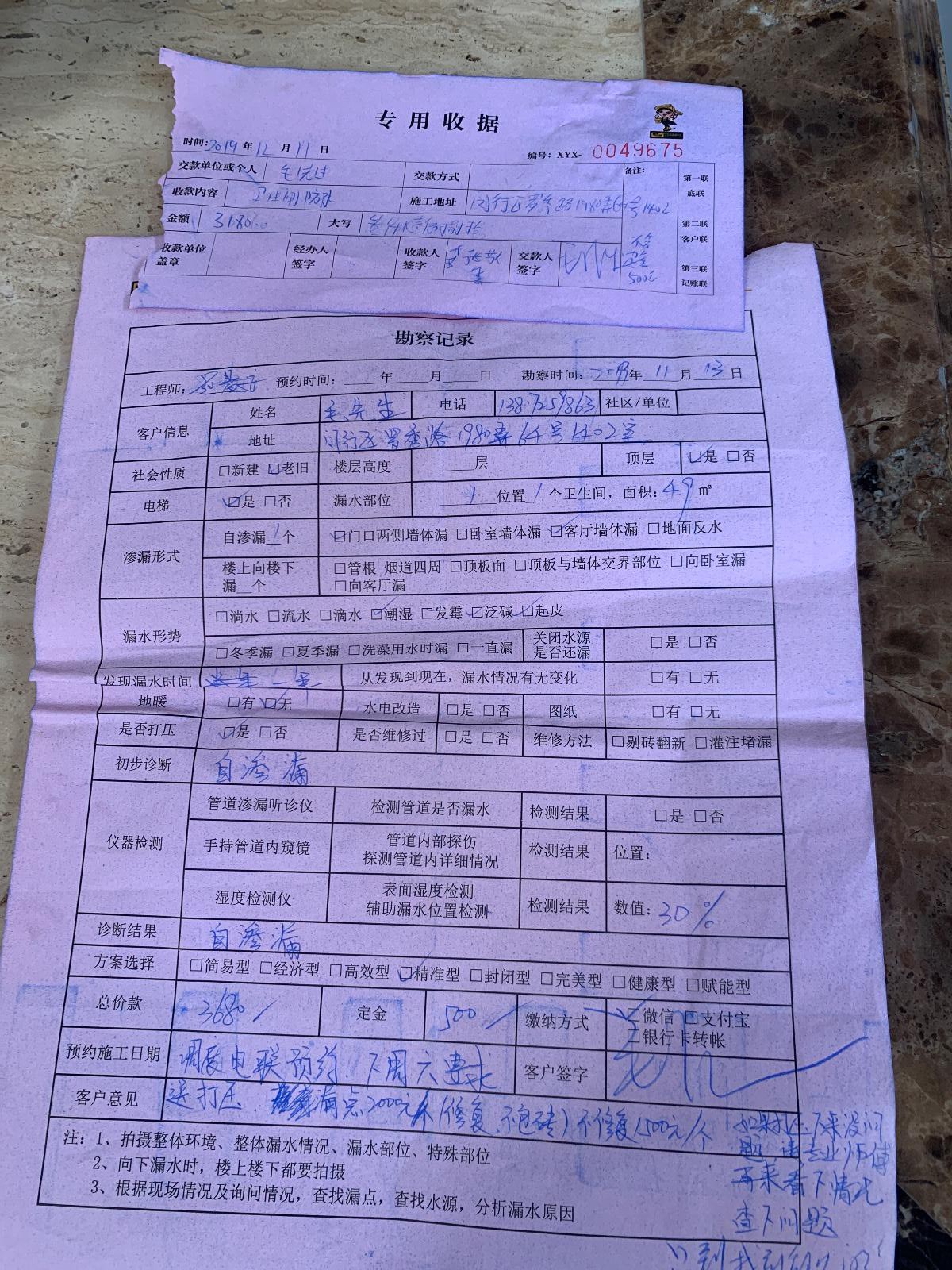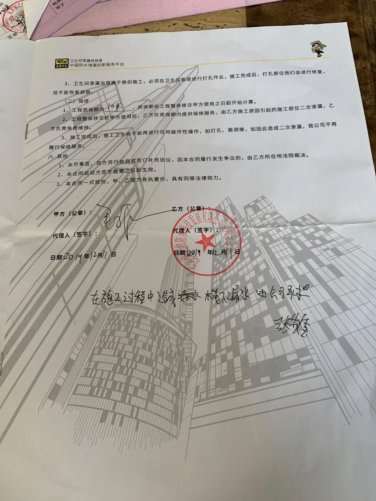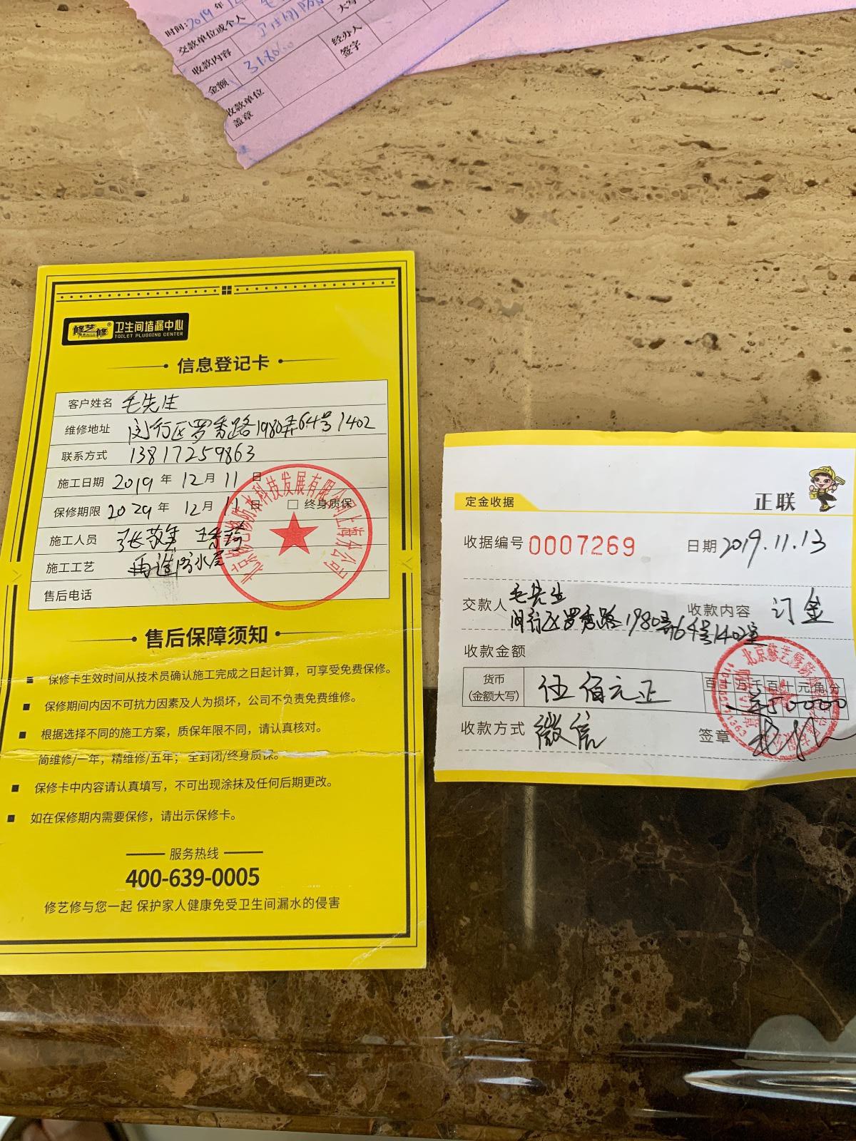 2019年11月13日,修藝修來(lái)我家查看衛(wèi)生間漏水情況,趙姓工作人員,承諾可以不砸磚修復(fù),并保修十年,簽定施工協(xié)議。我也付了訂金500元,12月19日,施工人員打洞注入完工,我也付尾款,總計(jì)3680元(包括定金)