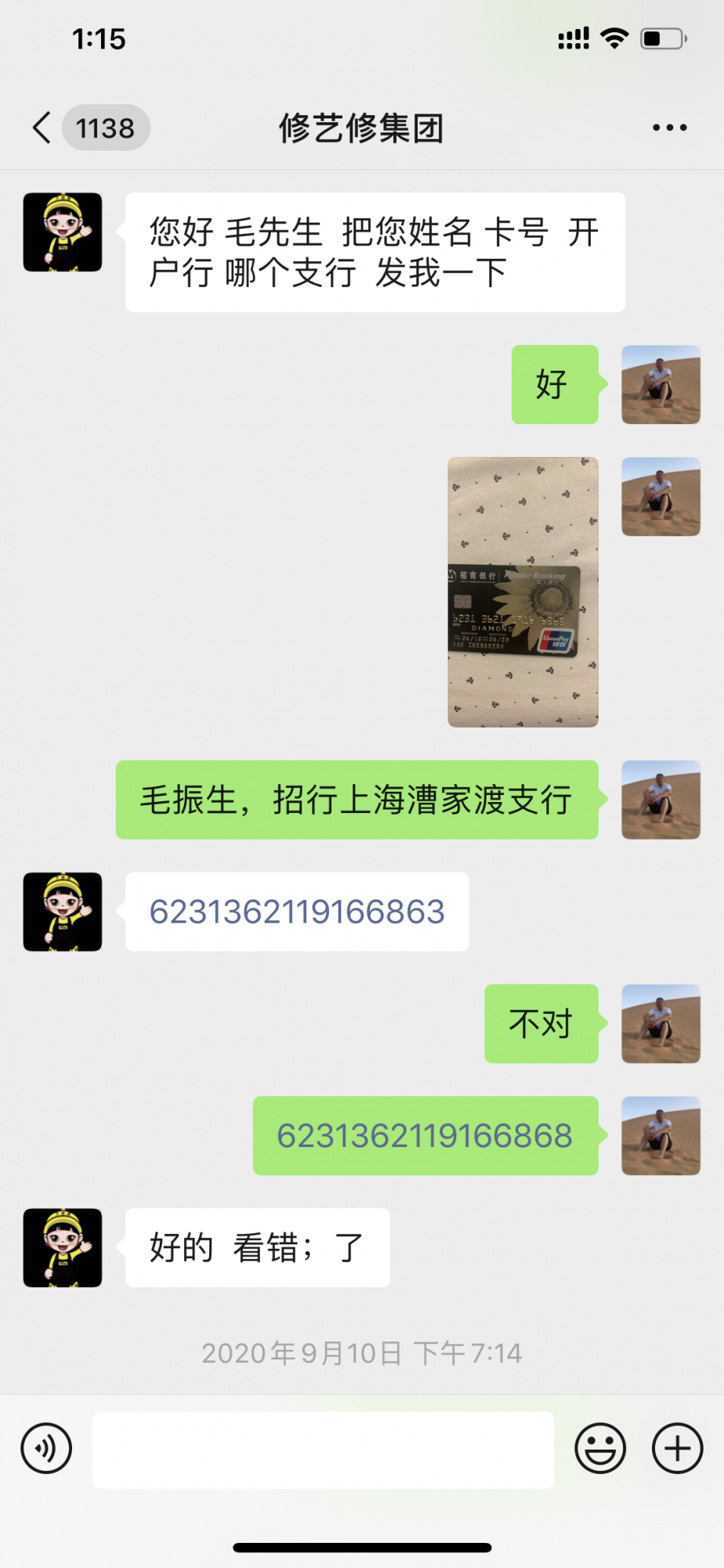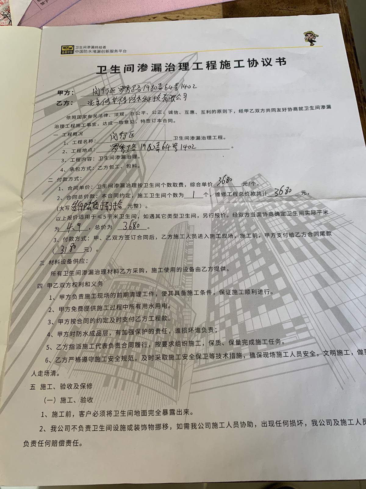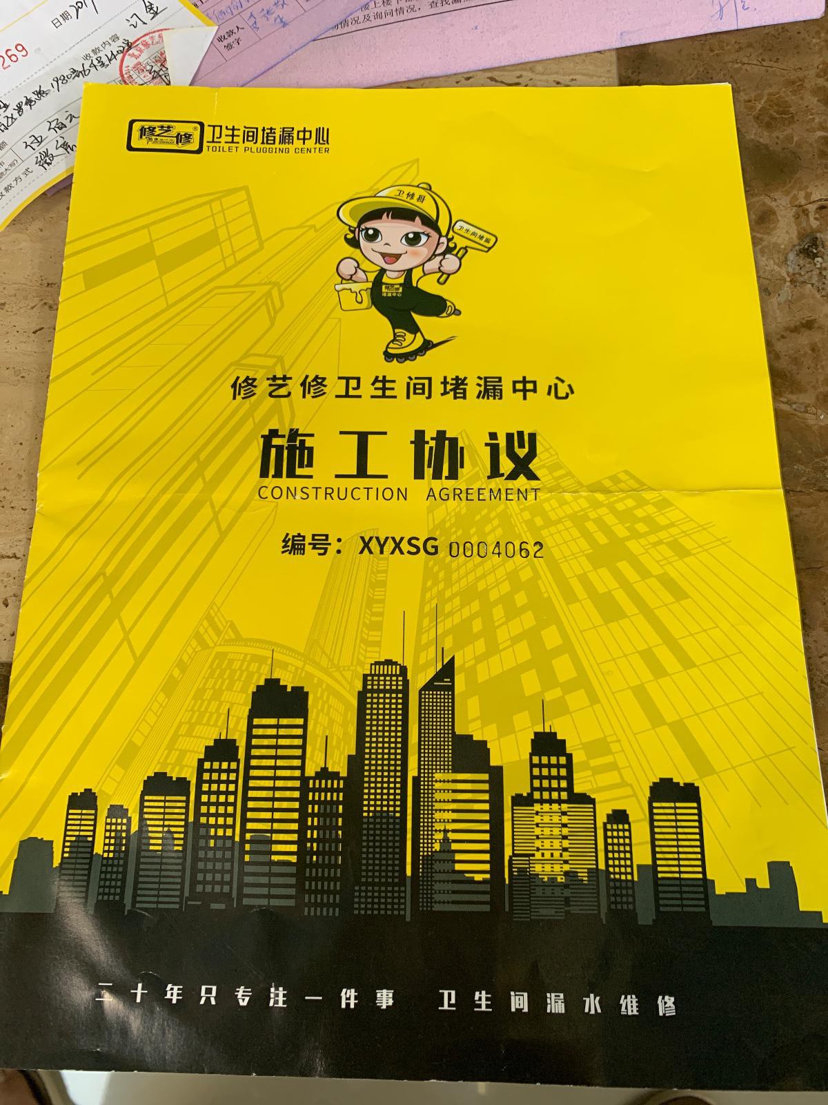 2019年11月13日,修藝修來(lái)我家查看衛(wèi)生間漏水情況,趙姓工作人員,承諾可以不砸磚修復(fù),并保修十年,簽定施工協(xié)議。我也付了訂金500元,12月19日,施工人員打洞注入完工,我也付尾款,總計(jì)3680元(包括定金)
