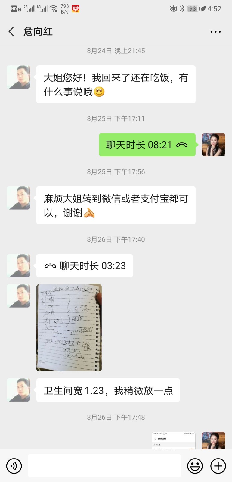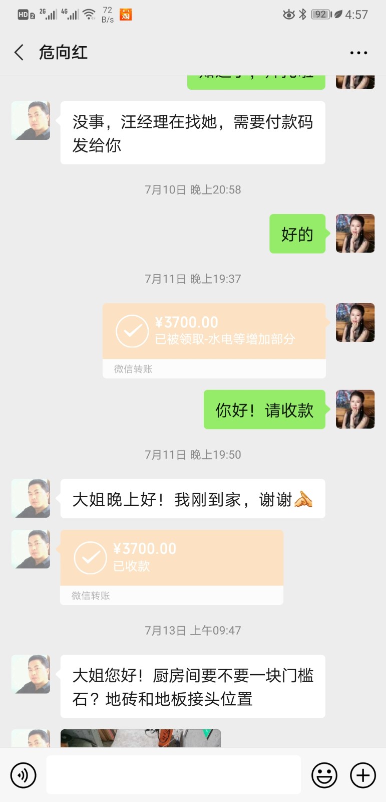 之后在與施工隊長危向紅溝通確認給我3800元后,并在得到他們工程汪球亮經(jīng)理的微信確認:在我從土巴兔平臺撤訴后,當(dāng)天就返還我3800元。