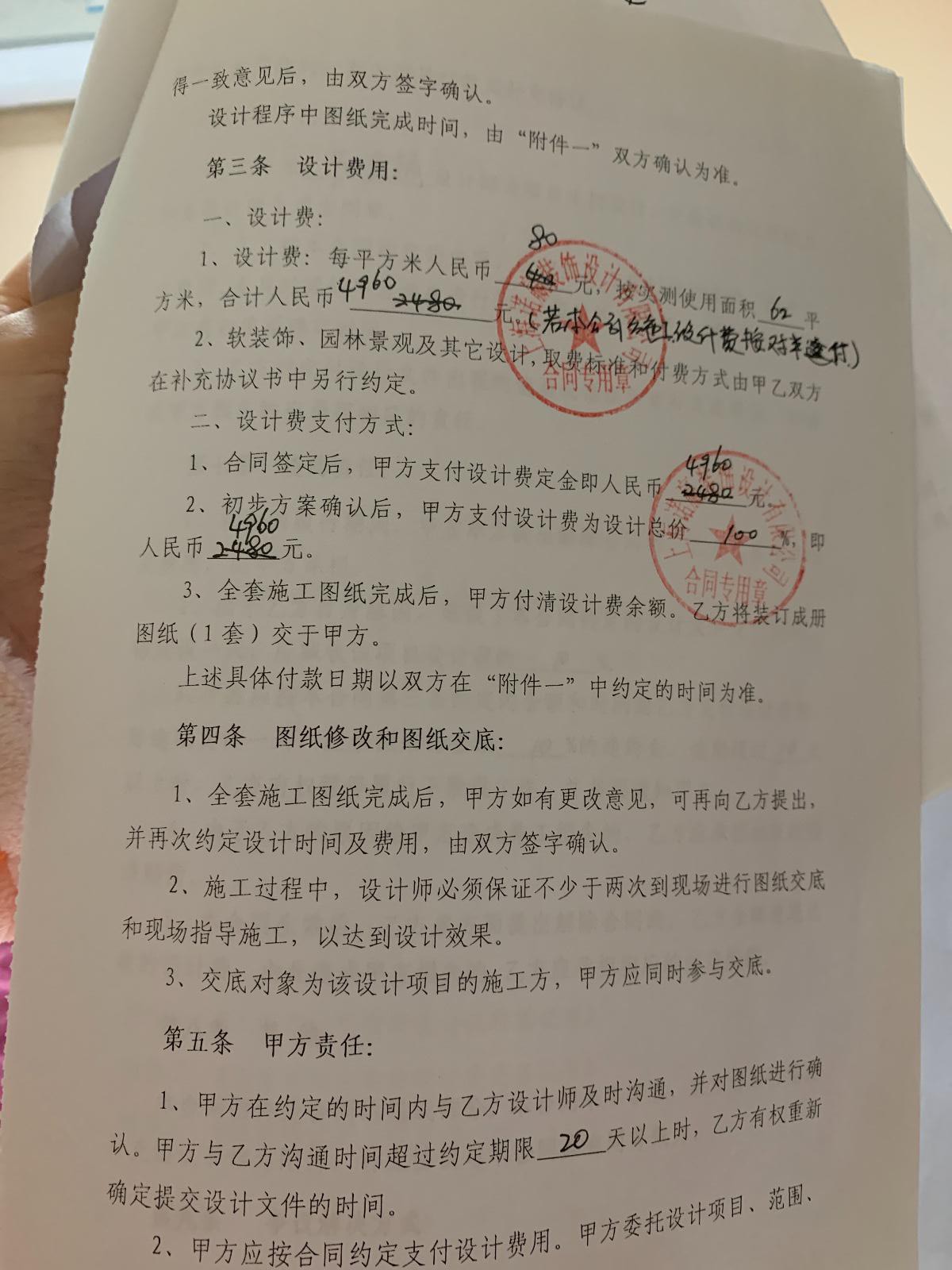可是一開始說好的設(shè)計(jì)費(fèi)價(jià)格是40一平方,但是他簽合同時(shí)又惡意加價(jià),在合同上寫了80一平方,總價(jià)4960元。