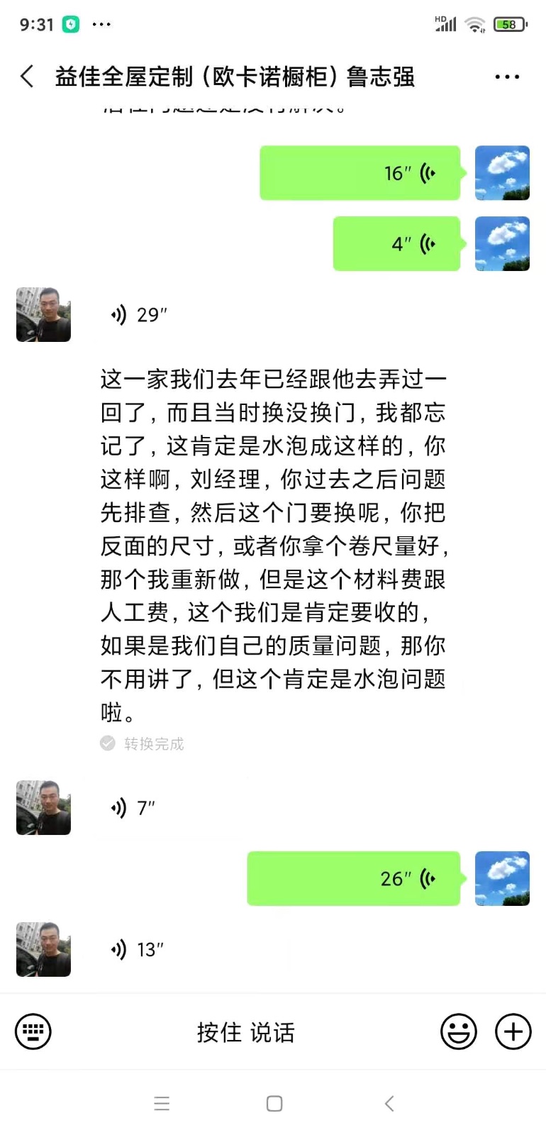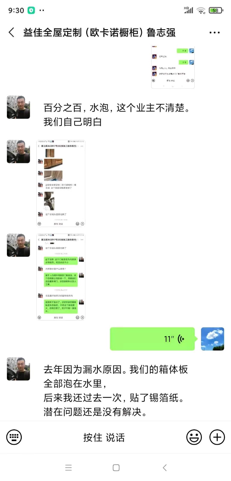 全包裝修,入住半年,櫥柜門板就起泡了,裝修公司說水泡的(施工期間有過水泡情況,當時底板都霉了,裝修公司給包了防水錫紙算簡易解決了),現(xiàn)在櫥柜門板起泡了裝修公司不承認,說是上面水槽滲水。