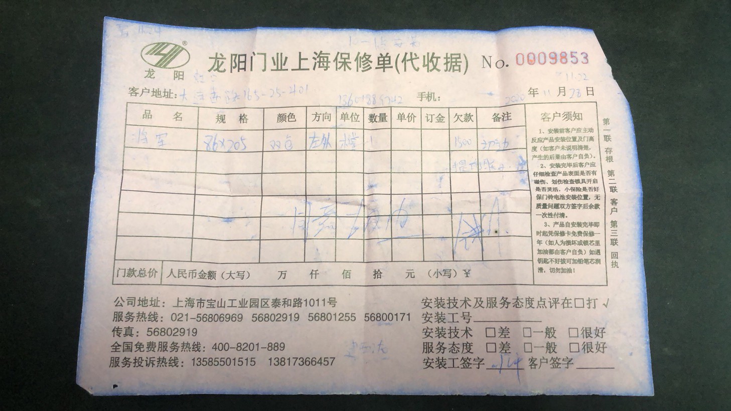| 投訴類型 | 其它 | 投訴人 | 錢(qián)** | 被投訴單位 | 龍陽(yáng)防盜門(mén)孫德永 |