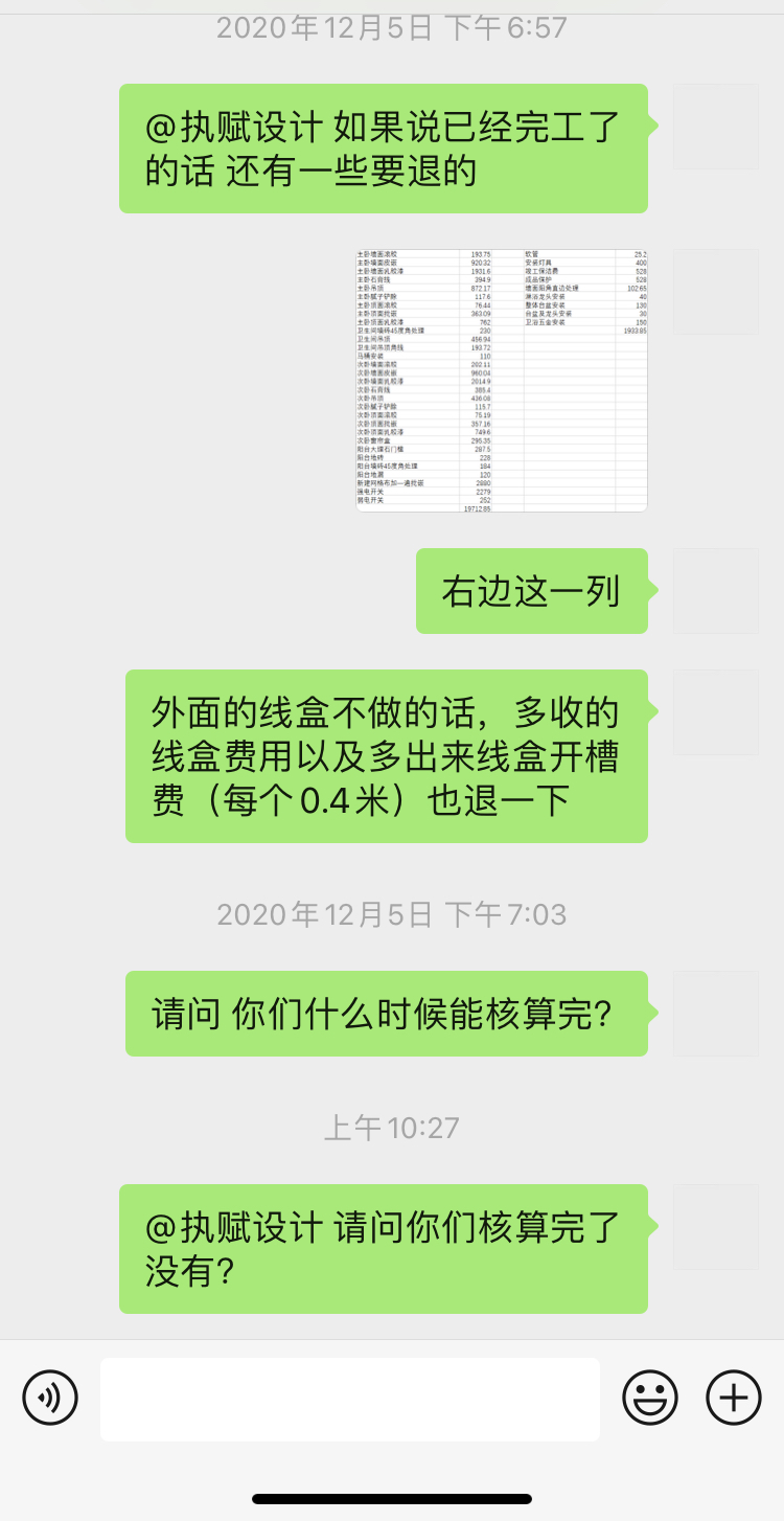 撤銷投訴之后,裝修公司表示要核算工程量,但此事再無下文。微信群里提到退費相關(guān)問題均不回復(fù)。我們不得已,只能再次求助監(jiān)管平臺。我們發(fā)布投訴不僅希望解決自己的問題,也希望更多人在裝修的時候能看到這條投訴,慎重選擇裝修公司。