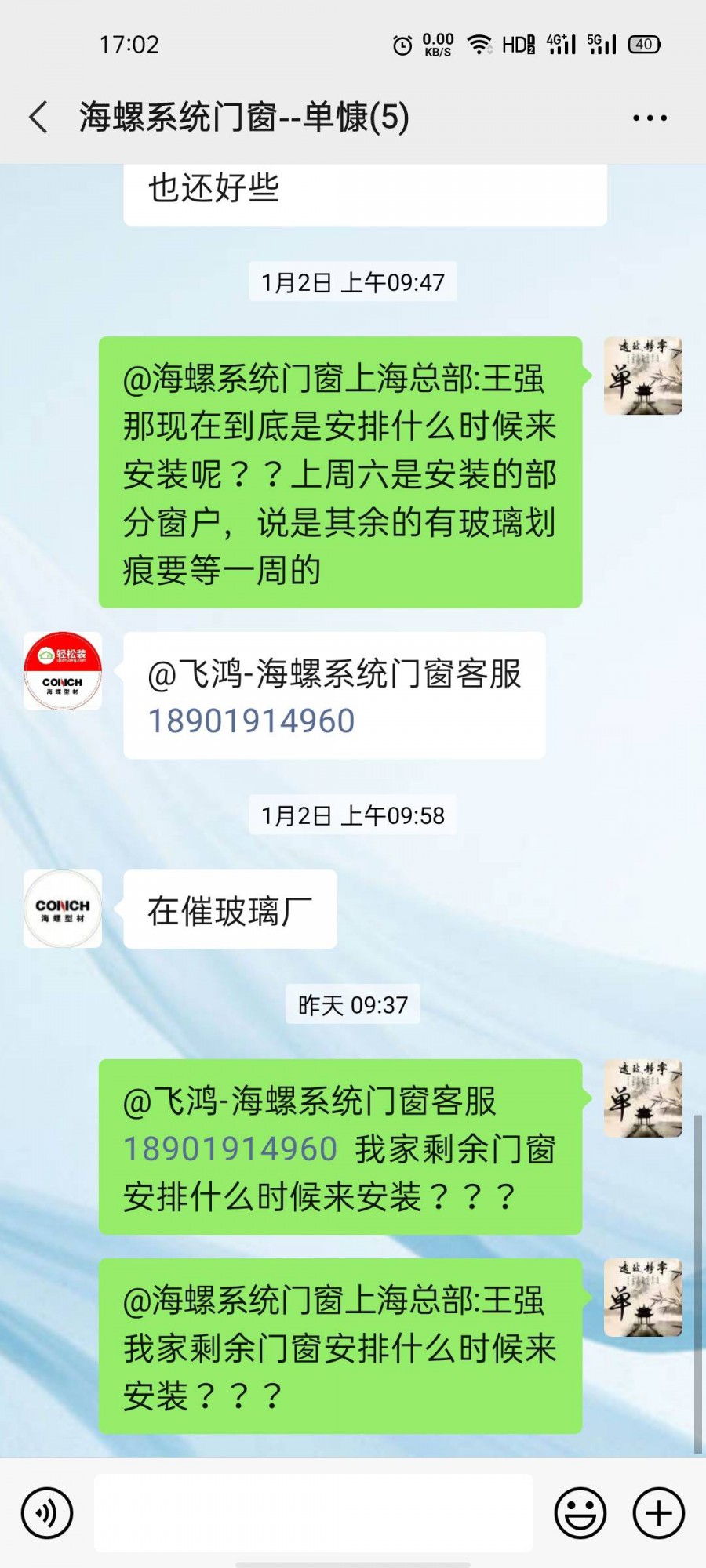 | 投訴類型 | 施工拖延 | 投訴人 | 單** | 被投訴單位 | 海螺門窗 |