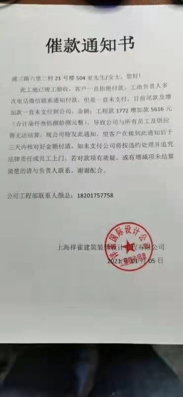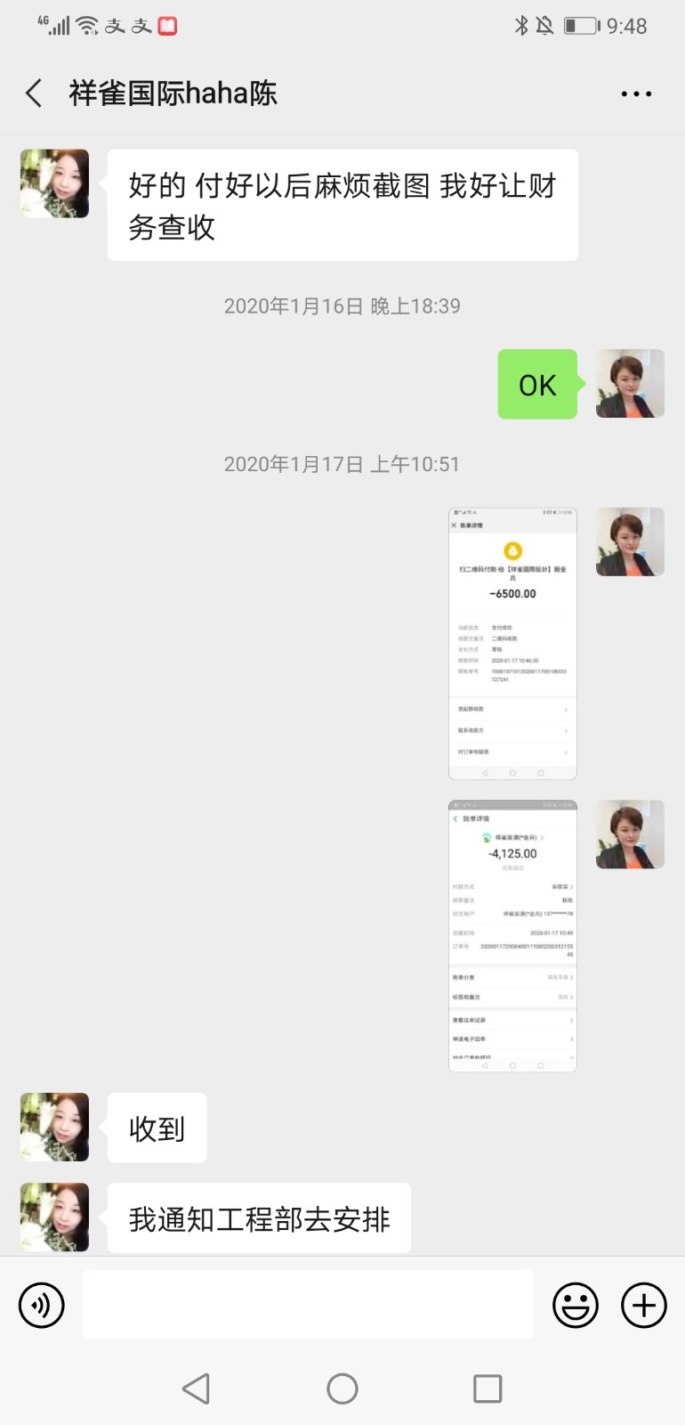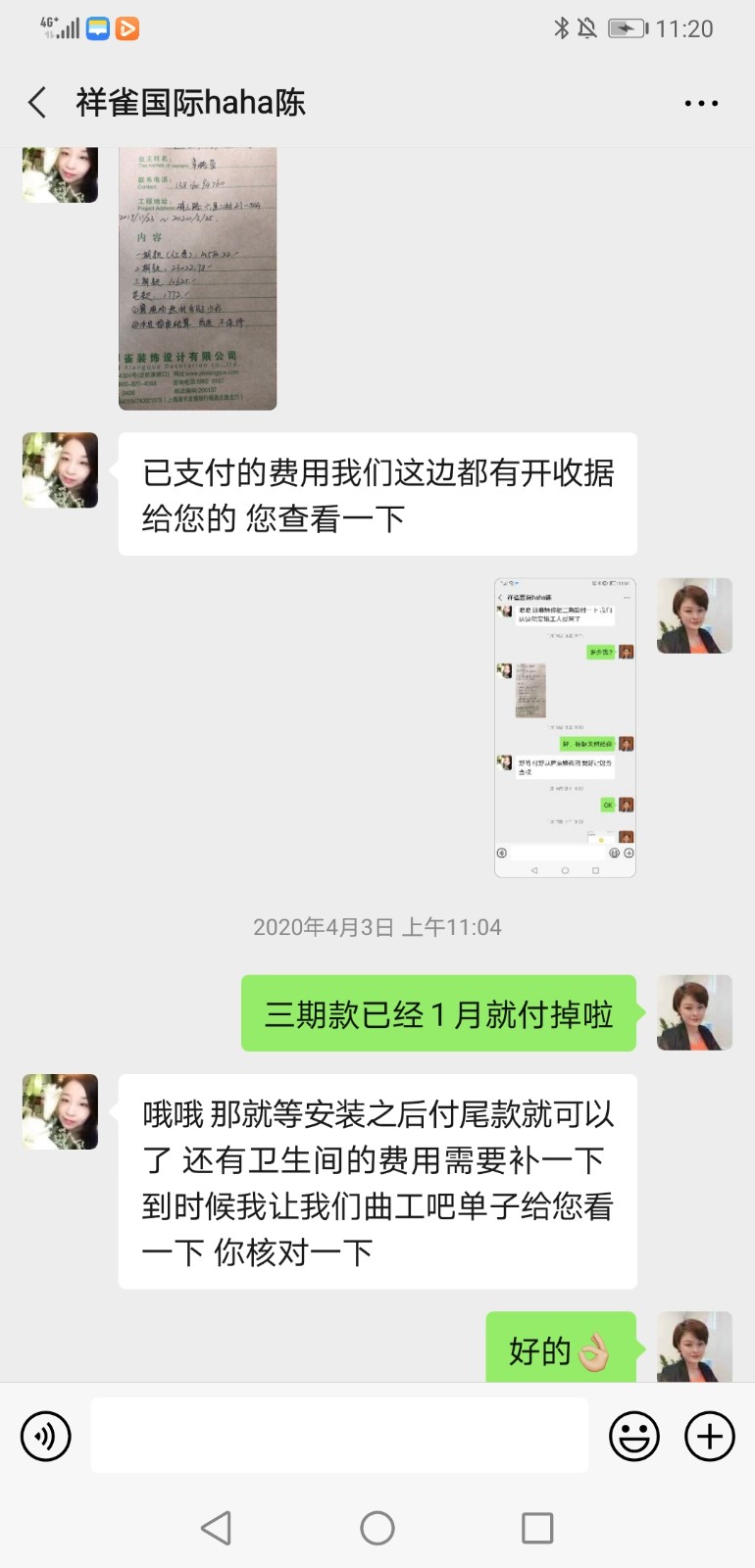 但未及時(shí)進(jìn)行三期工程,由于碰到春節(jié)+疫情,工期在不可抗力下暫停。2020年4月3日,詢問(wèn)小區(qū)物業(yè)可以入小區(qū)開(kāi)工,詢問(wèn)祥雀設(shè)計(jì)師工程安排,被告知未付三期款,所以未能進(jìn)行工程,我提醒告知已付款,繼續(xù)開(kāi)工。