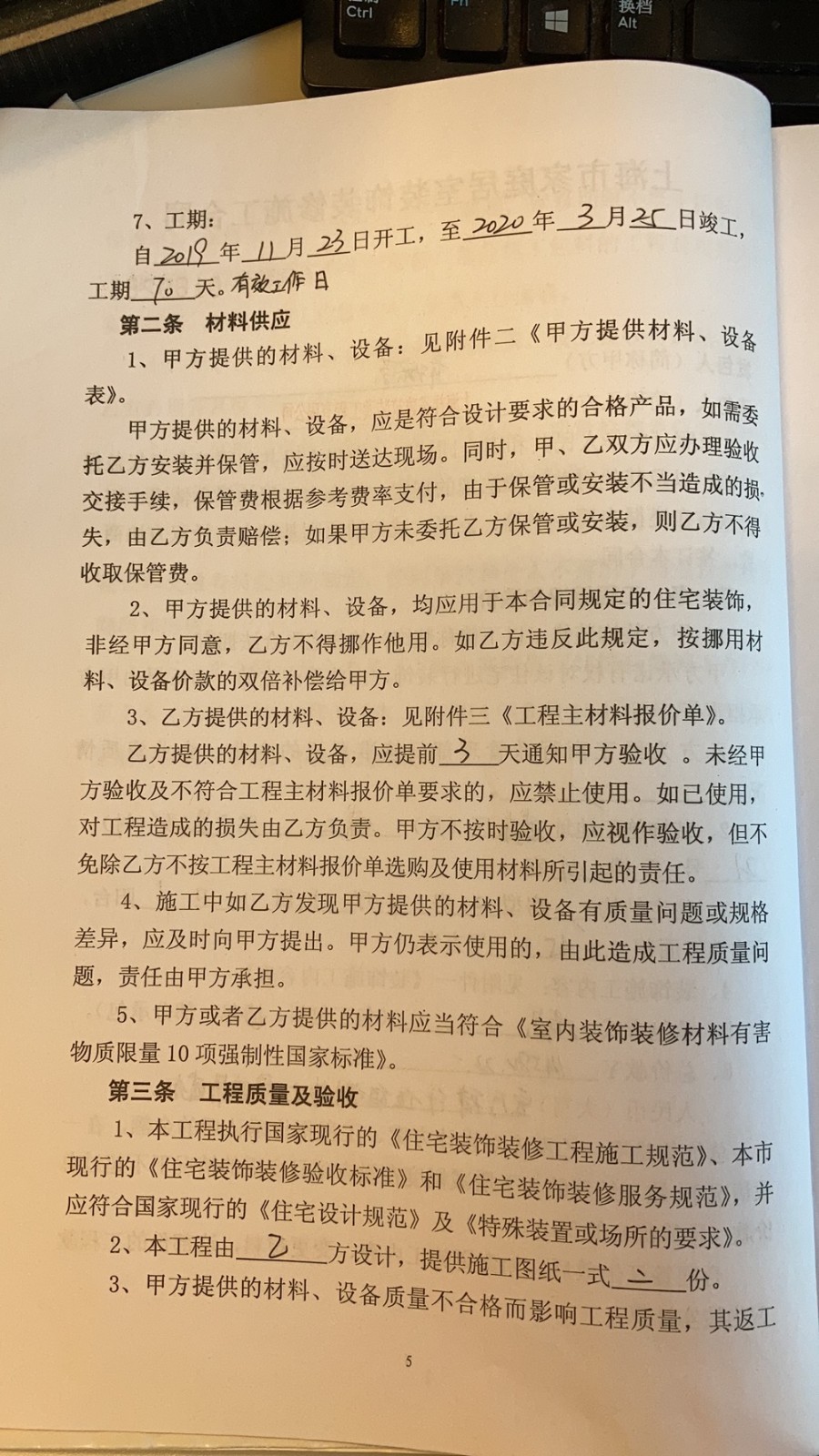 簽約日期:2019年11月5日,合同約定工期:自2019年11月23日-2020年3月25日竣工。工期70個(gè)有效工作日。