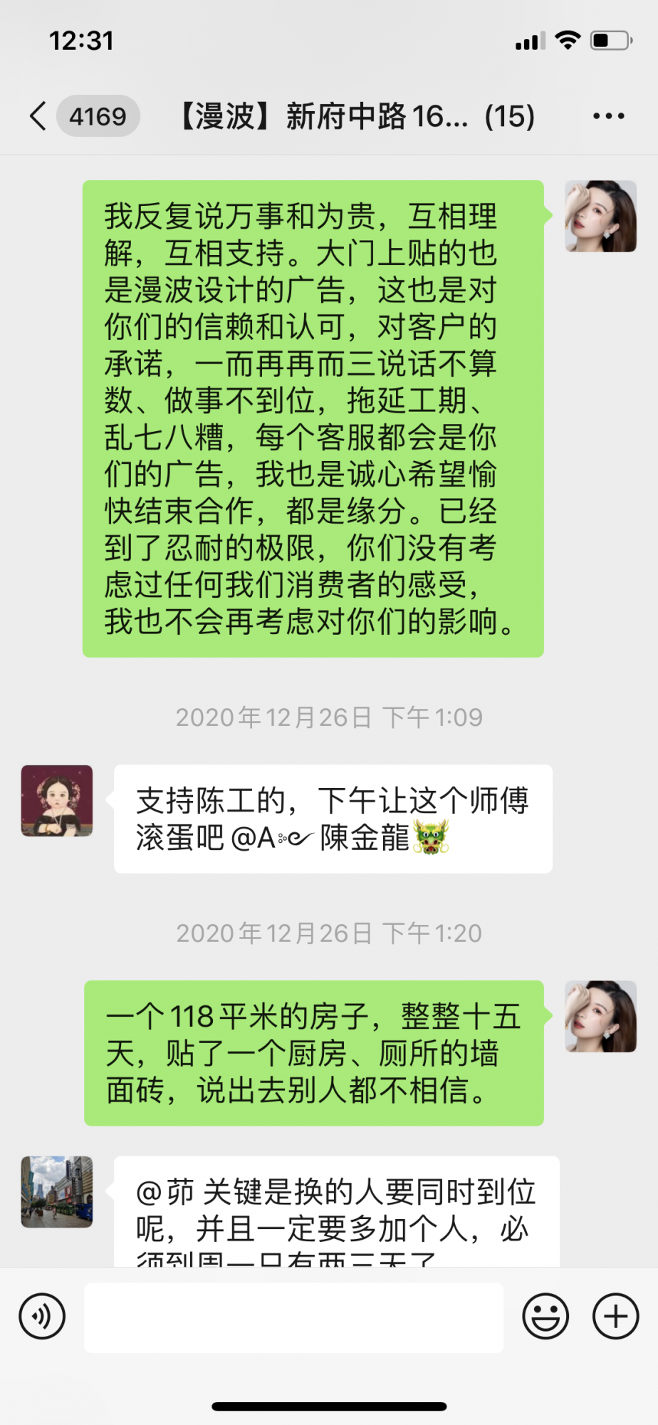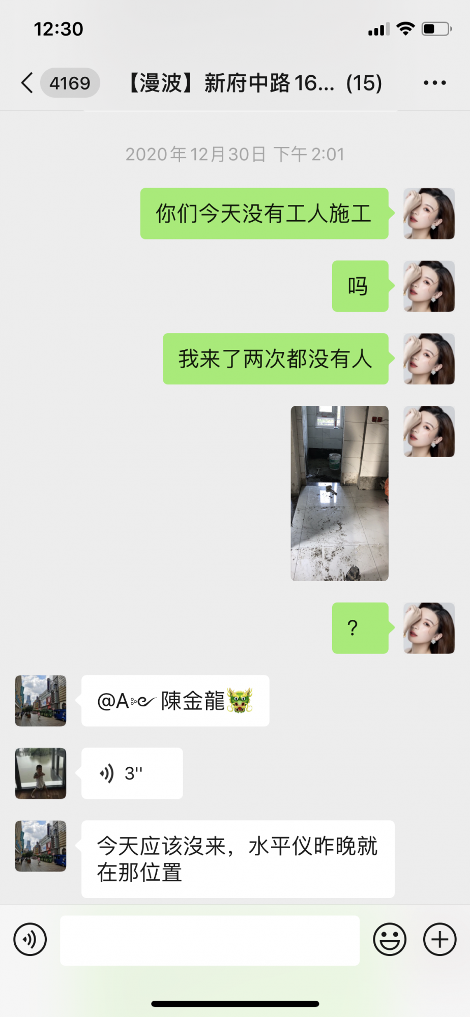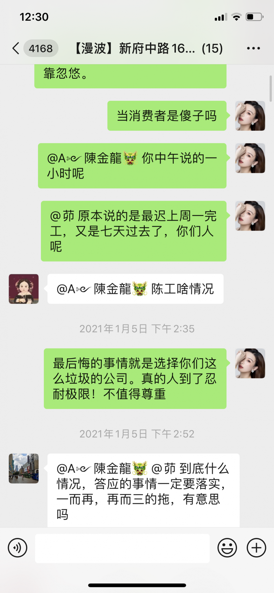 | 投訴類(lèi)型 | 施工質(zhì)量 | 投訴人 | 曾** | 被投訴單位 | 上海漫波建筑裝飾設(shè)計(jì)有限公司 |