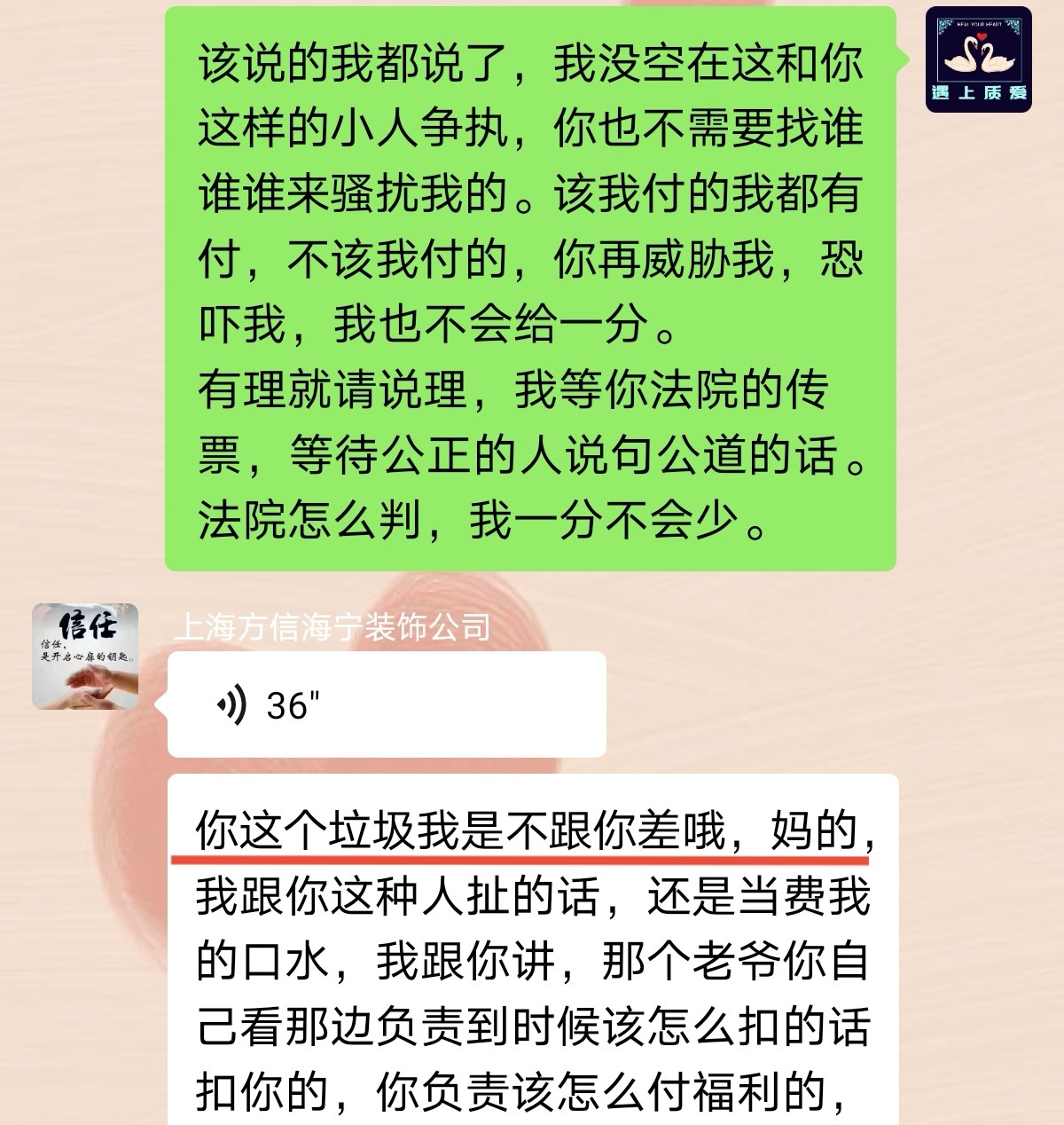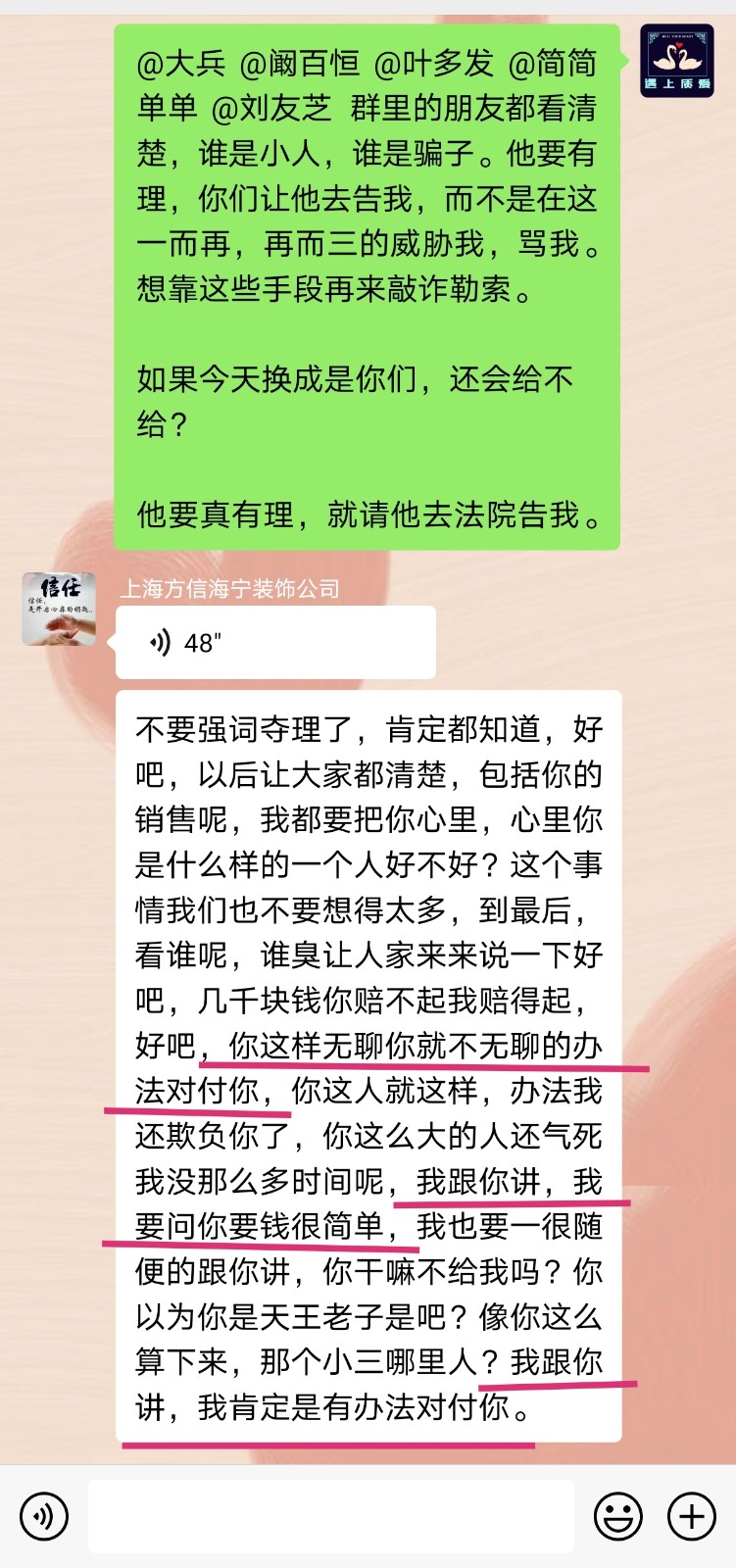 一天到晚威脅要對(duì)付我,還要去我父母家,鄰居家鬧。請(qǐng)大家做個(gè)證明,如果我,或是我的家人朋友有個(gè)三長(zhǎng)二短,請(qǐng)大家?guī)臀矣憘€(gè)說法。但愿裝修行業(yè)終能有一片晴天。