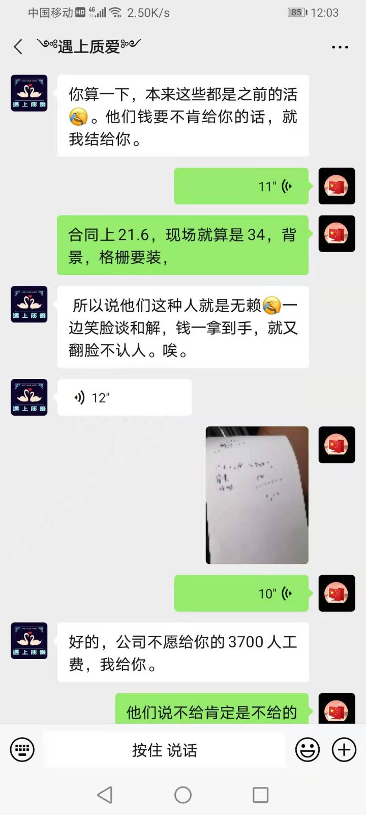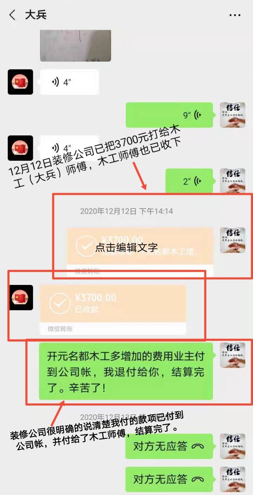 12月12日,裝修公司已經(jīng)很清楚的說明了我和木工的款項(xiàng)已結(jié)完。現(xiàn)在又要再來敲詐勒索3700元。