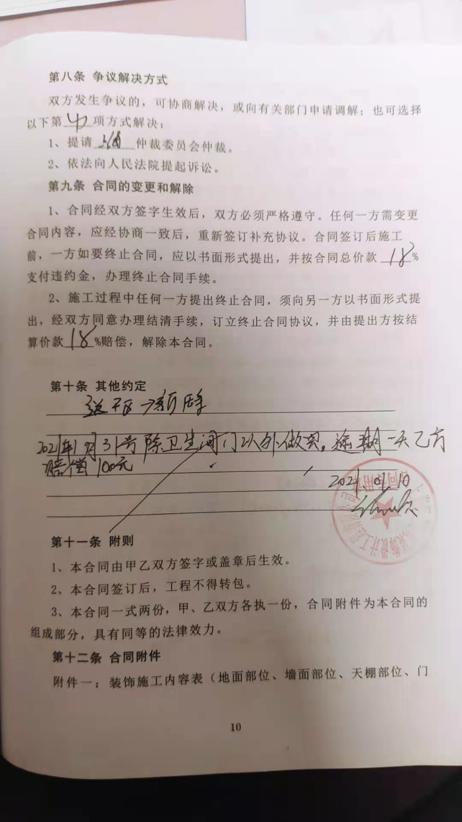 2021年1月10日簽訂補(bǔ)充合同,合同內(nèi)容:2021年1月31號(hào)除衛(wèi)生間門以外全部做完,預(yù)期一天乙方賠付100元。2021年1月31號(hào)現(xiàn)場(chǎng)查驗(yàn)時(shí),進(jìn)度嚴(yán)重拖延,截止2021年2月23日,房間墻面未粉圖,衛(wèi)生間吊頂未安裝。