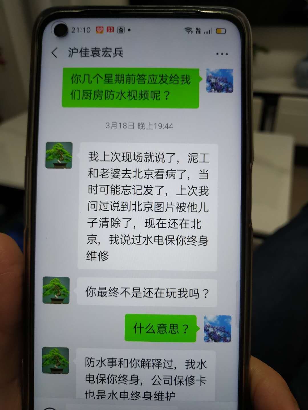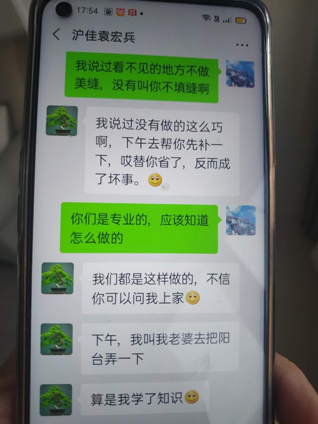 套餐中包含的淋浴房的門,因設(shè)計(jì)問題,無法安裝,在工程管家的建議下,換成了三移門,在扺扣掉原有門的基礎(chǔ)上,另外加了1200元。該移門存在嚴(yán)重的質(zhì)量問題,一個(gè)月不到就維修了好幾次,修好了,幾天后又出現(xiàn)問題,至今不能正常使月。防水施工違反了國家強(qiáng)制性規(guī)定,陽臺(tái)沒有做閉水試驗(yàn),廚房連防水涂料都沒有刷。不知道防水工程是如何驗(yàn)收并通過的。滬佳工程管家和工程部負(fù)責(zé)人聲稱:滬佳規(guī)定廚房和陽臺(tái)只做防水,都不做閉水試驗(yàn)(有錄音作證)。做防水,不做閉水試驗(yàn),你怎么知道防不防水?這是明顯的偷工減料。你們這么做是欺騙了成千上萬信任你們、請你們裝修的業(yè)主,并給他們留下了重大隱患,你們的良心不會(huì)疼嗎?是的,你們聲稱,隱蔽工程終生保修。真碰到問題,你們來一句,這不是質(zhì)量問題,這是房屋下沉或是地鐵振動(dòng)引起的,你們以為我們都是傻子嗎?還有一些質(zhì)量及增項(xiàng)問題?,F(xiàn)在滬佳回避所有問題,全權(quán)委托工程管家向我們催余款。希望上海裝潢網(wǎng)為我們主持公道。