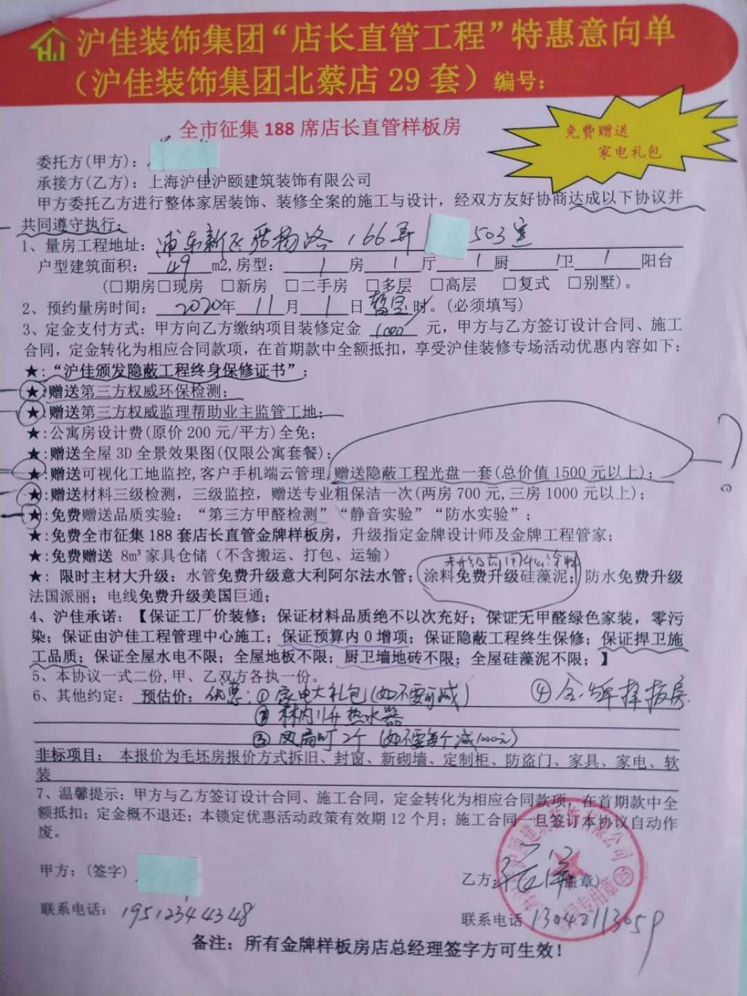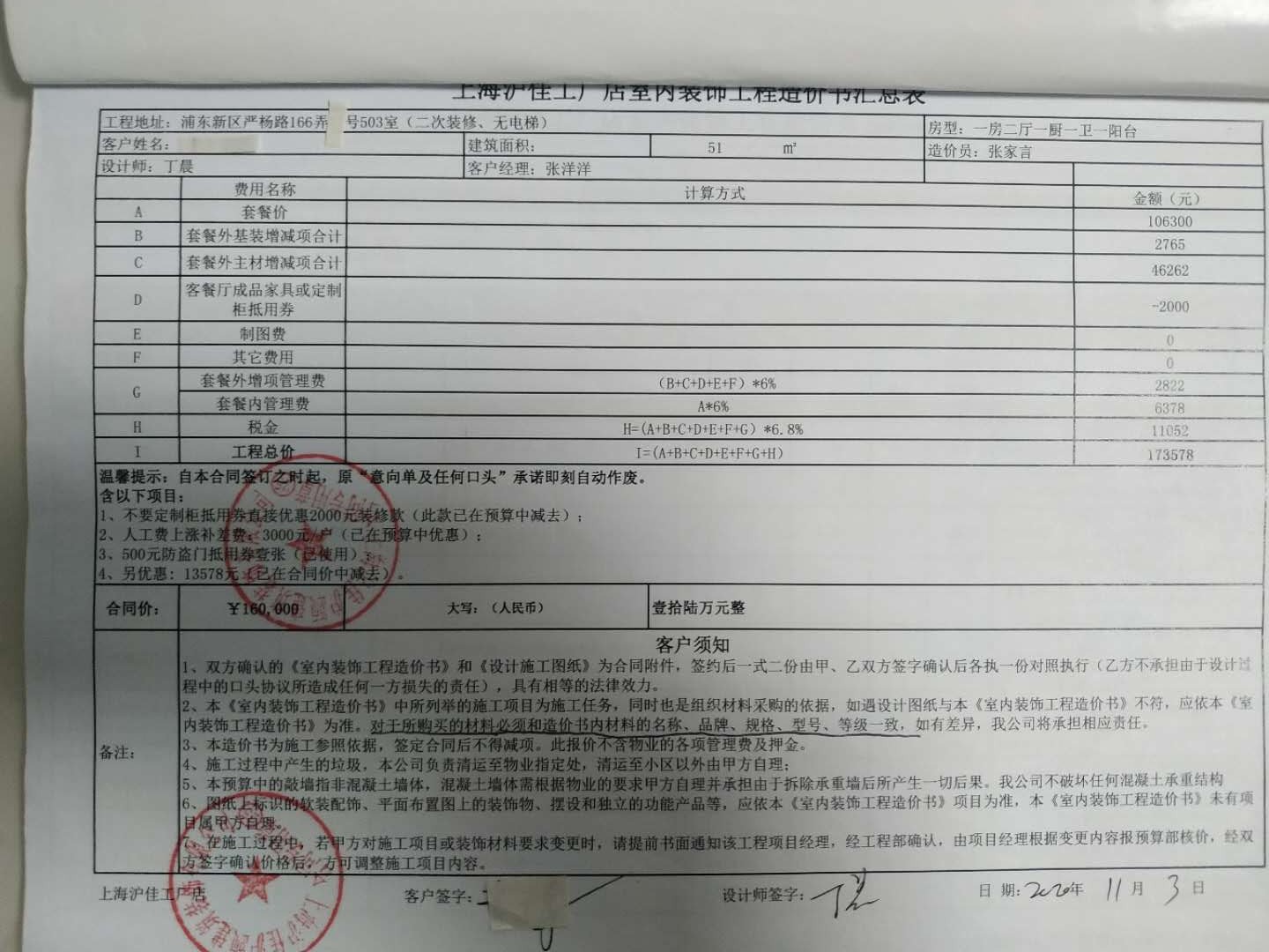 本人于2020年11月1日在滬佳北蔡店(五星路412號)簽了協(xié)議書(裝修成一房一廳一廚一衛(wèi)一陽臺(tái)),并交了1000元定金。于11月3日補(bǔ)交了2萬9千元定金,并鑒了裝修合同。滬佳利用業(yè)主對他們的充分信任,在業(yè)主未知曉的情況下,玩弄文字游戲,在合同中,改成了一房二廳一廚一衛(wèi)一陽臺(tái),為以后的增項(xiàng)收費(fèi),打下了埋伏。在施工中,工程管家既是包工頭,又是工人,缺乏應(yīng)有的監(jiān)管。監(jiān)理形同虛設(shè),并缺乏最基本的職業(yè)道德。最終驗(yàn)收只檢查了開關(guān)和插座,在柜子還未全部安裝好,馬桶都未安裝的情況下,鑒字,全部合格,驗(yàn)收通過。二天后,海爾廠家在試洗衣機(jī)的時(shí)候,由于下水道堵塞,造成了樓下家里大量進(jìn)水,差點(diǎn)釀成大禍。