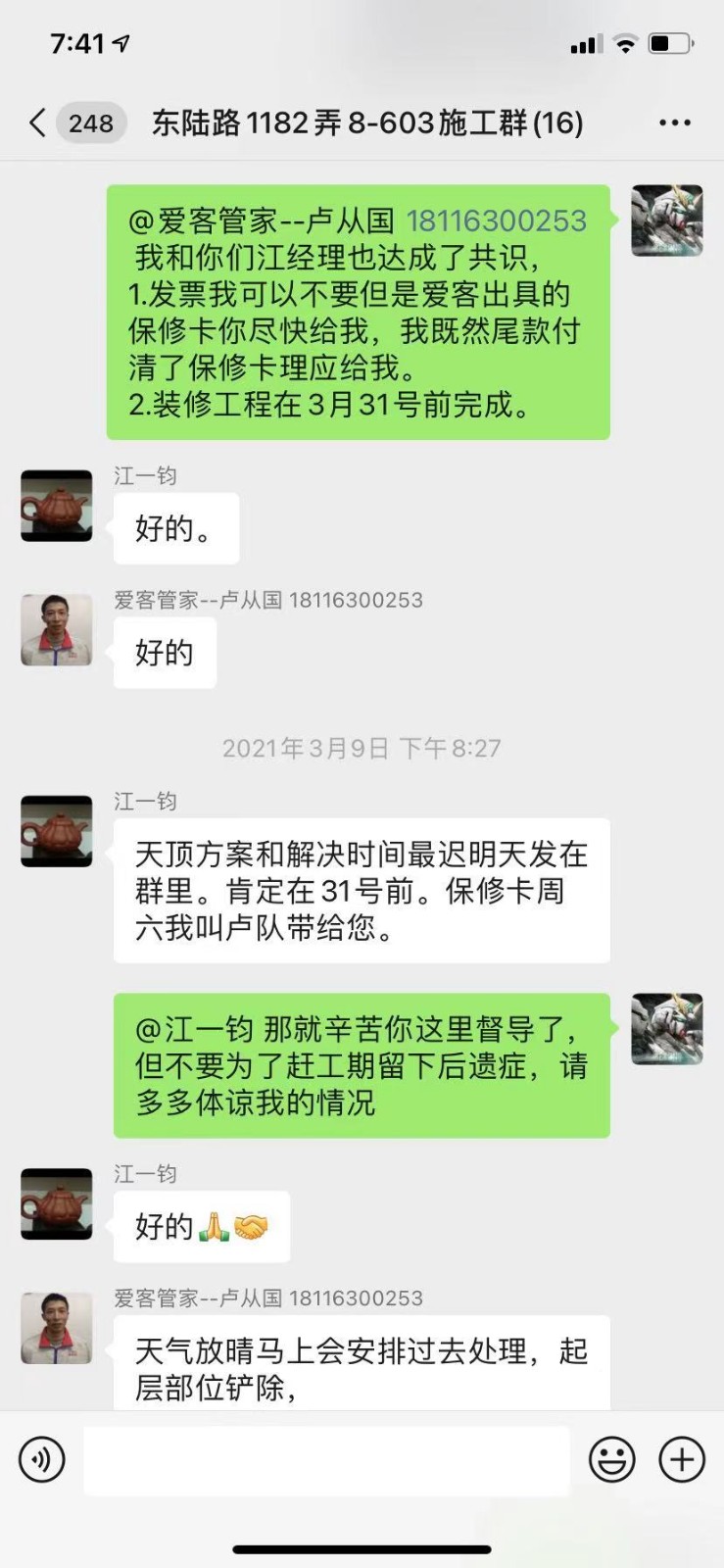 上海艾窠兒電子商務有限公司(愛客裝飾)及尚品宅配為居間人根據(jù)合同履行應在2020年12月25日完成硬裝交付,但至過年前仍然未完成裂縫處理及其他硬裝需要完成的工程,其后上海艾窠兒電子商務有限公司裝修隊長盧從國以工人工資想在年前結算回家過年為由希望本人可以把尾款支付,但從未告知尾款支付后即算硬裝驗收完成(微信存有聊天記錄),本人屬于好說話的類型,就按照盧隊長所說支付了尾款4000多元,但至3月9日仍未完工,天花板不斷開裂,我聯(lián)系了上海艾窠兒電子商務有限公司(愛客裝飾)江一鈞經理,但江經理的回答是尾款付清即認定工程完成,本人無法接受及向市場管理局及消保委反應情況,之后尚品宅配及上海艾窠兒電子商務有限公司(愛客裝飾)多次協(xié)商懇求之下讓我撤銷投訴,我表示只要能夠在4月1日前完工,我既不追究,但至今4月14日仍天花板及墻面開裂未得到有效性的解決,故進行再次投訴并向上海艾窠兒電子商務有限公司(愛客裝飾)及尚品宅配,本人也將正式起訴尚品宅配,因尚品宅配作為居間人未履行告知尾款支付即認定工程交房完成義務及尚品宅配未履行事先約定承諾的上門交付驗收及監(jiān)督工作。按照合同規(guī)定本人向尚品宅配所屬地上海市徐匯區(qū)人民法院提起訴訟,根據(jù)民法典及簽約的裝修合同,要求按照合同履行工程延期賠償并承擔保潔費、誤工費、訴訟費等其他合理合法的賠償要求;賠償共計5萬元人民幣;