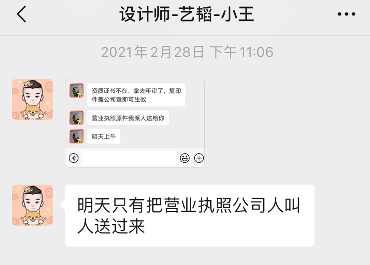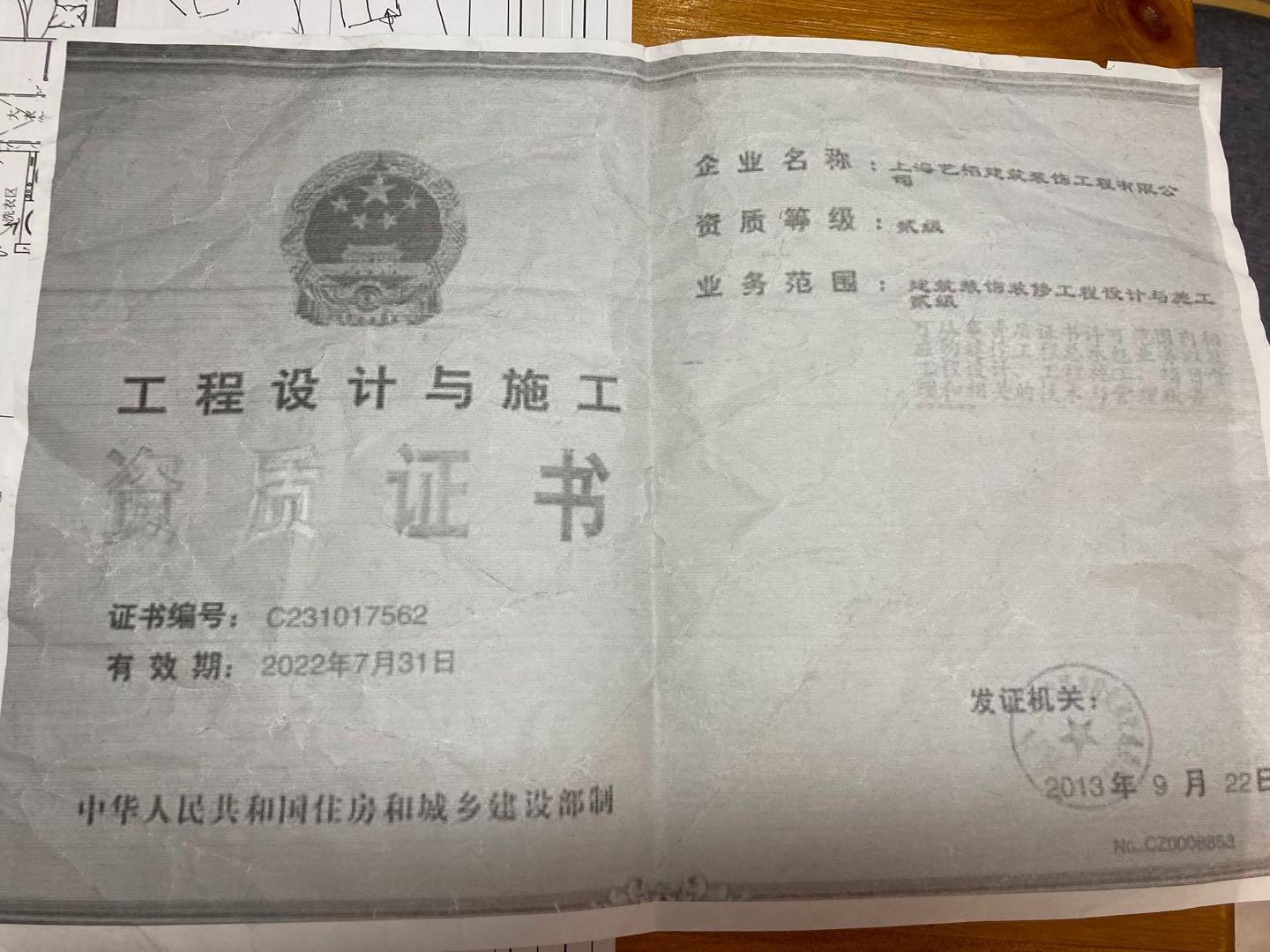 裝修合同簽訂前,曾請對方出示營業(yè)執(zhí)照及資質(zhì)證明,對方提供了兩份復印件,并稱資質(zhì)證書拿出年檢了,經(jīng)查對方并沒有資質(zhì)證書,但為了片區(qū)顧客信任,并未如實相告,而且當時提供了與其公司名稱相似,但并不是其公司的資質(zhì)證書,企業(yè)名稱為:上海藝韜建筑裝飾工程有限公司,資質(zhì)等級為二級