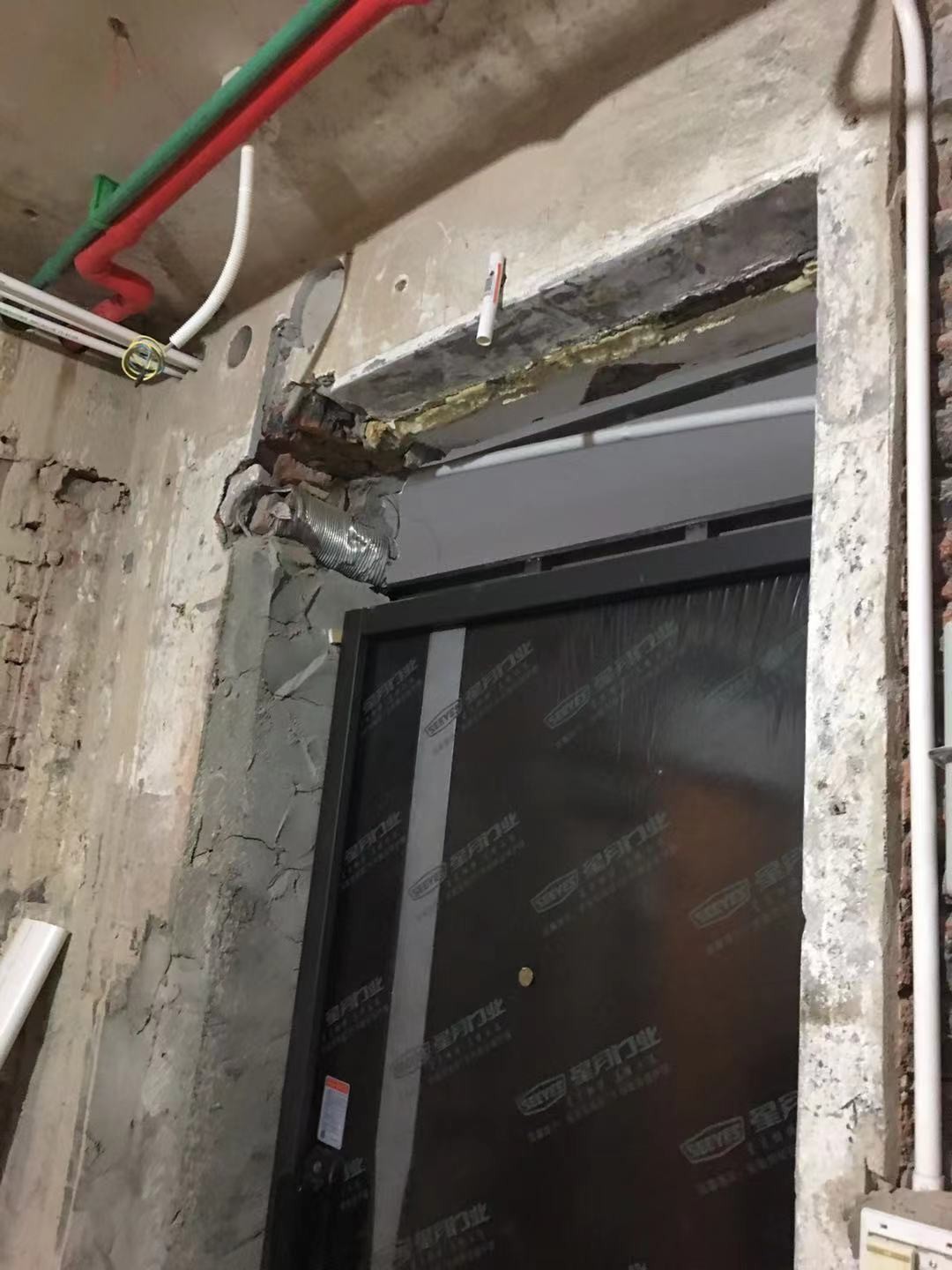 在門洞沒有做好,門頭也沒做好,門也保護(hù),墻面沒有鏟到紅磚,電線亂拉