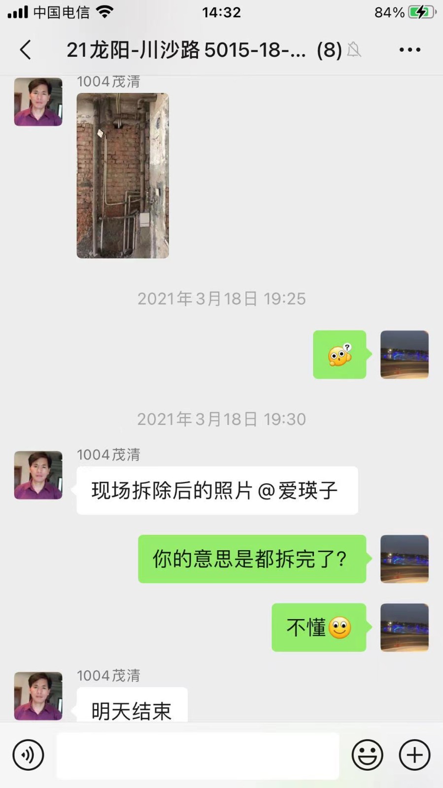3月18日打電話給張茂清工頭,發(fā)來消息明天拆舊完成(19日)與官網(wǎng)3月16日已拆舊已完成相矛盾,其實(shí)到目前為至折舊都沒完成,百安居存在欺詐