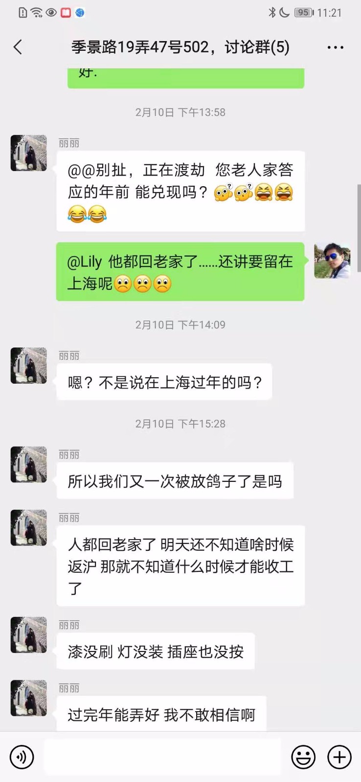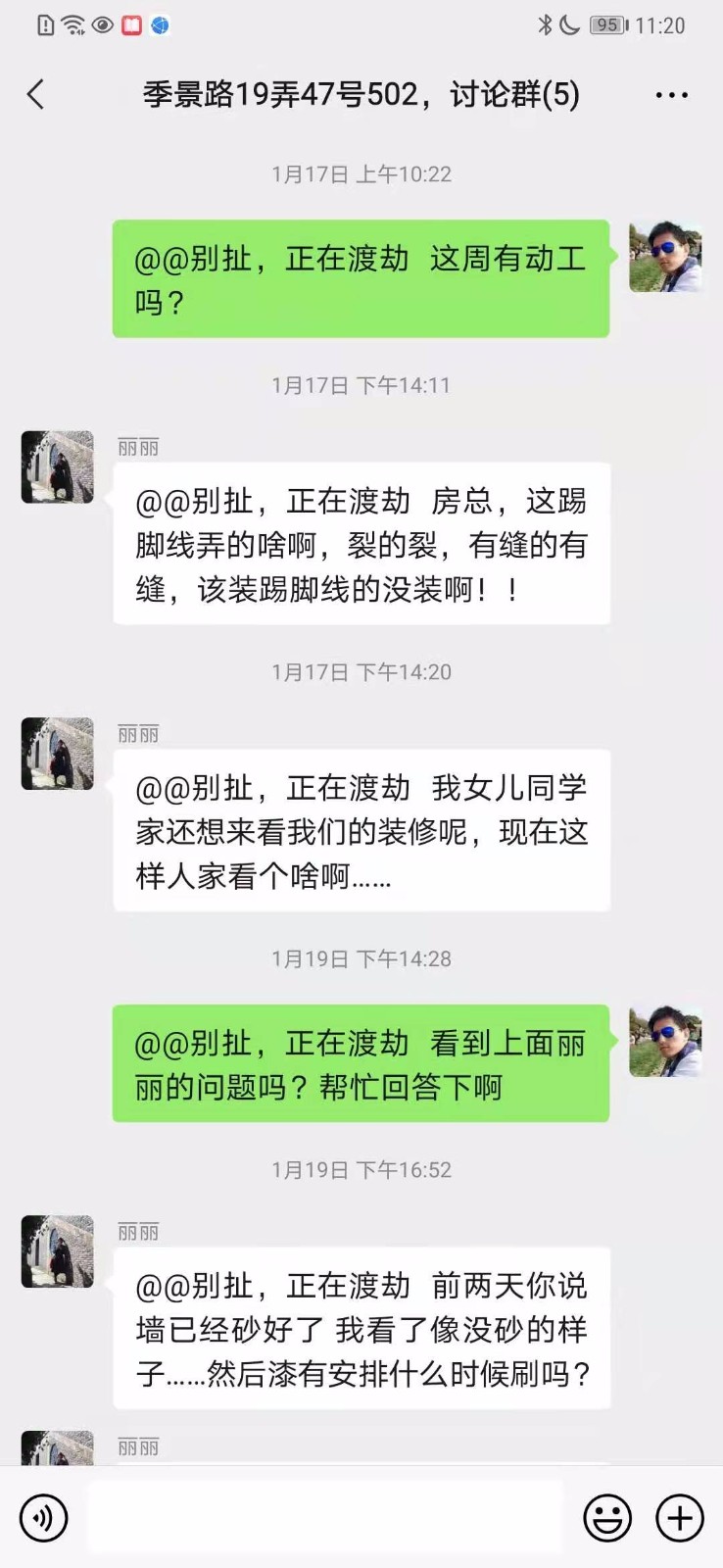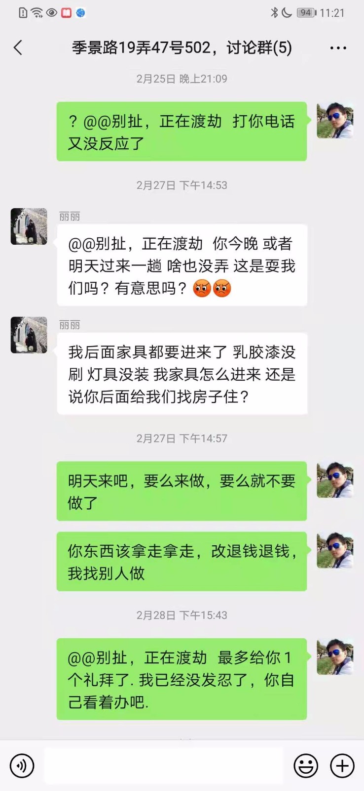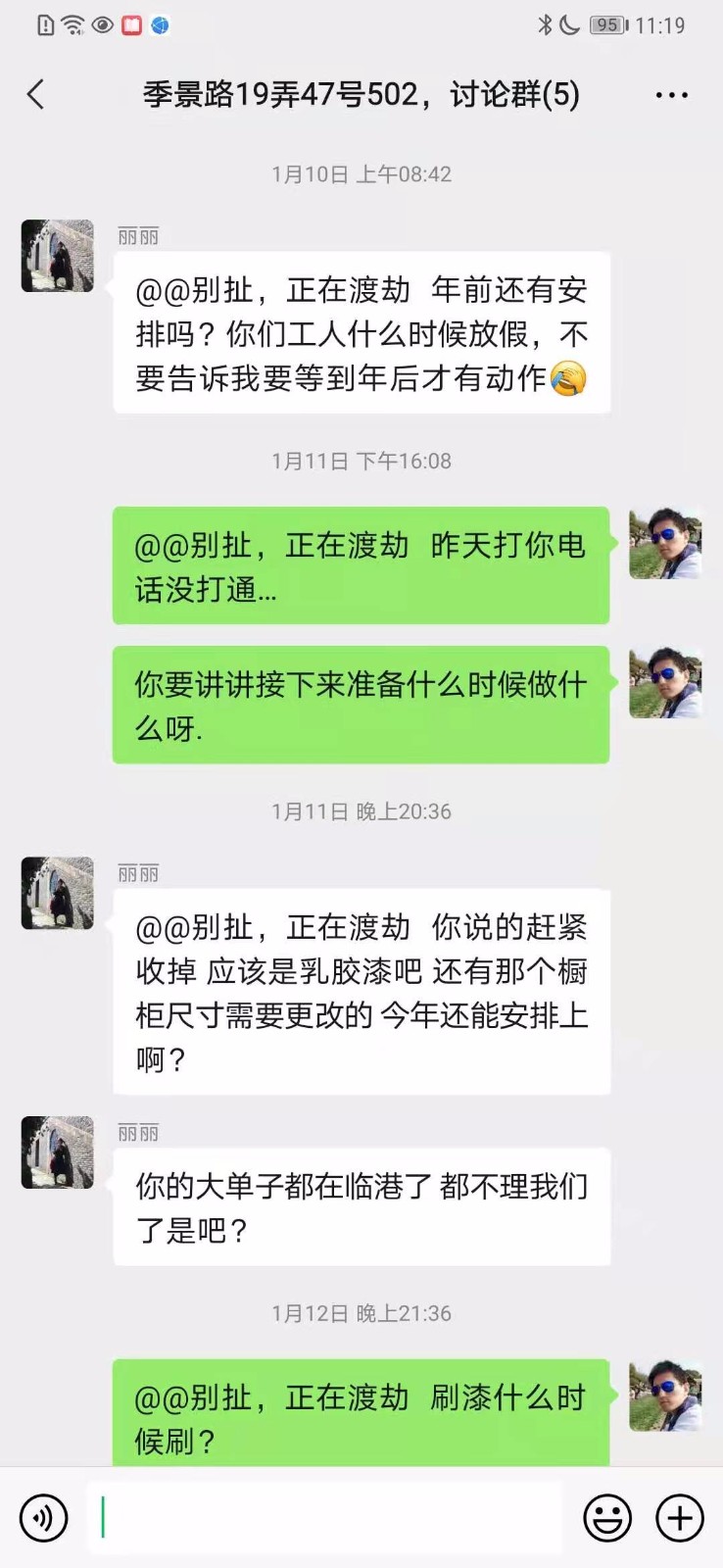 - 但是乙方卻是各種拖延. 基本上在10月29拿到第三筆裝修款后進(jìn)度就龜速緩慢, 完全不管工程的拖延對于甲方的影響, 而且不誠信對待客戶,基本上總是連蒙帶騙,拖延時間, 總體而言平均2-3周完成一項(xiàng)小時間, 其中刷墻這個子項(xiàng)目尤其夸張, 基本上刷墻從12月初一直拖到3月中下旬才完成..