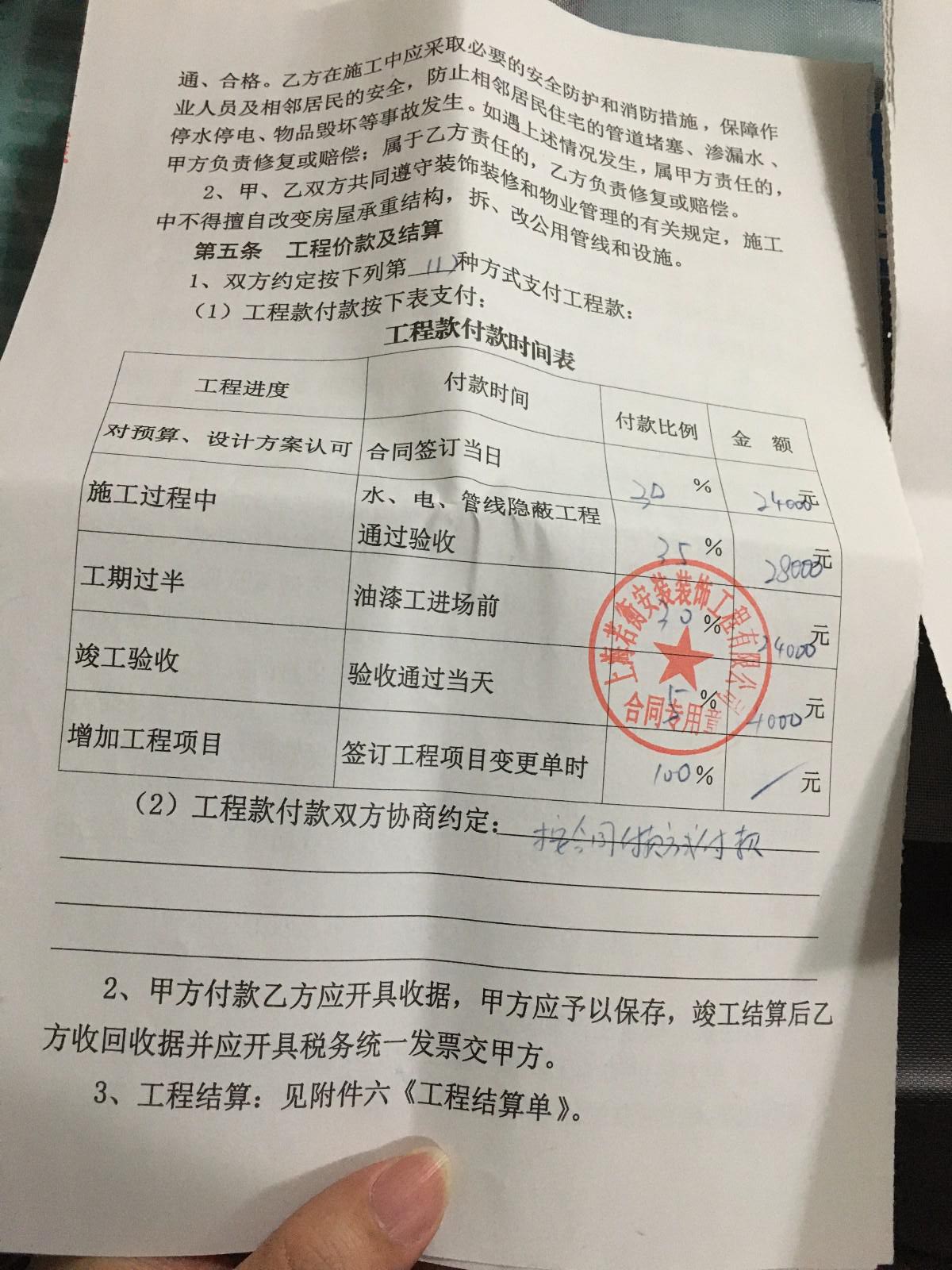 - 整個過程中甲方(我)都是按照合同付款: 第一筆裝修款2020-8-23支付;第二筆裝修款2020-9-5 支付, 第三筆裝修款10-29支付