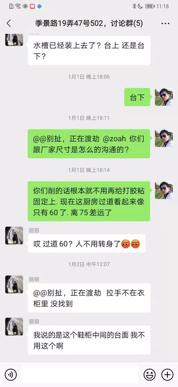 -廚房與進(jìn)門柜之間的距離設(shè)計值是70cm, 結(jié)果最后實(shí)際只留了58cm, 在與乙方針對于這個事情溝通的幾個月,乙方答應(yīng)返工臺面的情況下一拖再拖最終沒有修改臺面也沒有修改櫥柜. 工期拖延太久甲方急需入駐無奈只能建議乙方拆除兩塊柜版然后購買60cm 冰箱勉強(qiáng)放置