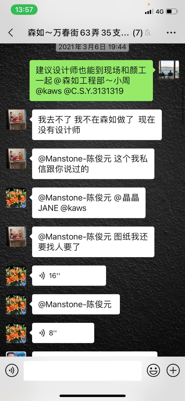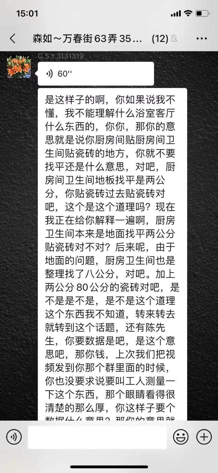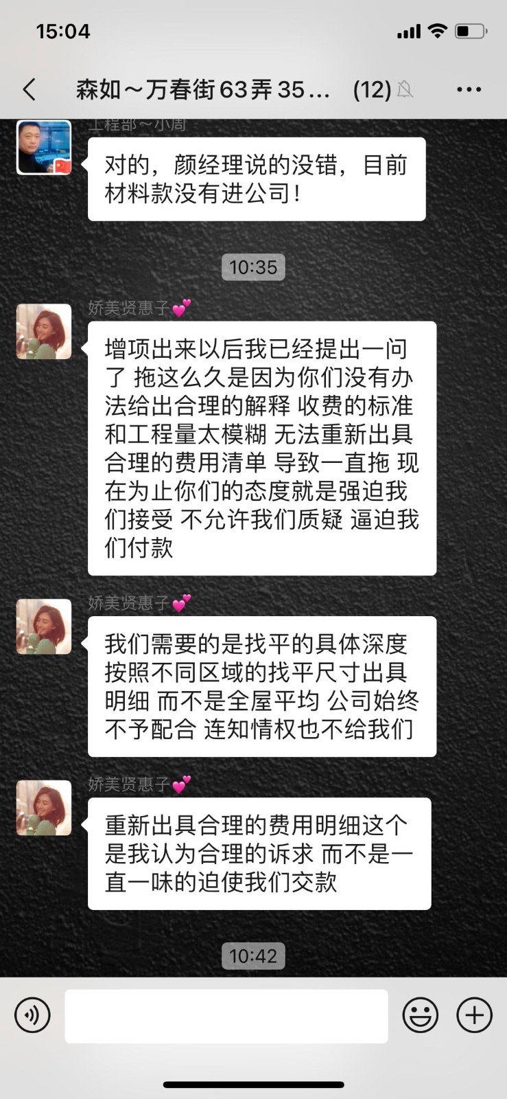 2021年4月18日,該公司施工隊在沒有事先與我約定的情況下,在我家進(jìn)行地面找平,2021年4月26日,施工隊負(fù)責(zé)人現(xiàn)場告知地面找平有10公分左右的厚度(有視頻為證),2021年5月6日施工隊負(fù)責(zé)人提供施工增項單時告知我全屋地面找平平均厚度為8公分(有照片為證),并稱實際廚房、陽臺、衛(wèi)生間找平厚度有10公分,但根據(jù)我事先咨詢第三方質(zhì)檢公司(土巴兔旗下質(zhì)檢公司)得知一般地面找平在3到4公分比較合理,于是我向該公司施工隊提出異議,并要求他們拿出地面找平平均厚度有8公分的測量依據(jù)。我多次與該公司負(fù)責(zé)人和施工隊負(fù)責(zé)人溝通(主要是在裝修的微信群里)并向該公司表明我們作為消費者應(yīng)享有該有的知情權(quán)(告知我地面找平的測量依據(jù)),施工隊的負(fù)責(zé)人和該公司負(fù)責(zé)人拒絕提供相關(guān)的測量依據(jù),以我們沒有到現(xiàn)場為由,要求我們認(rèn)可他們的增項單并支付相關(guān)費用。