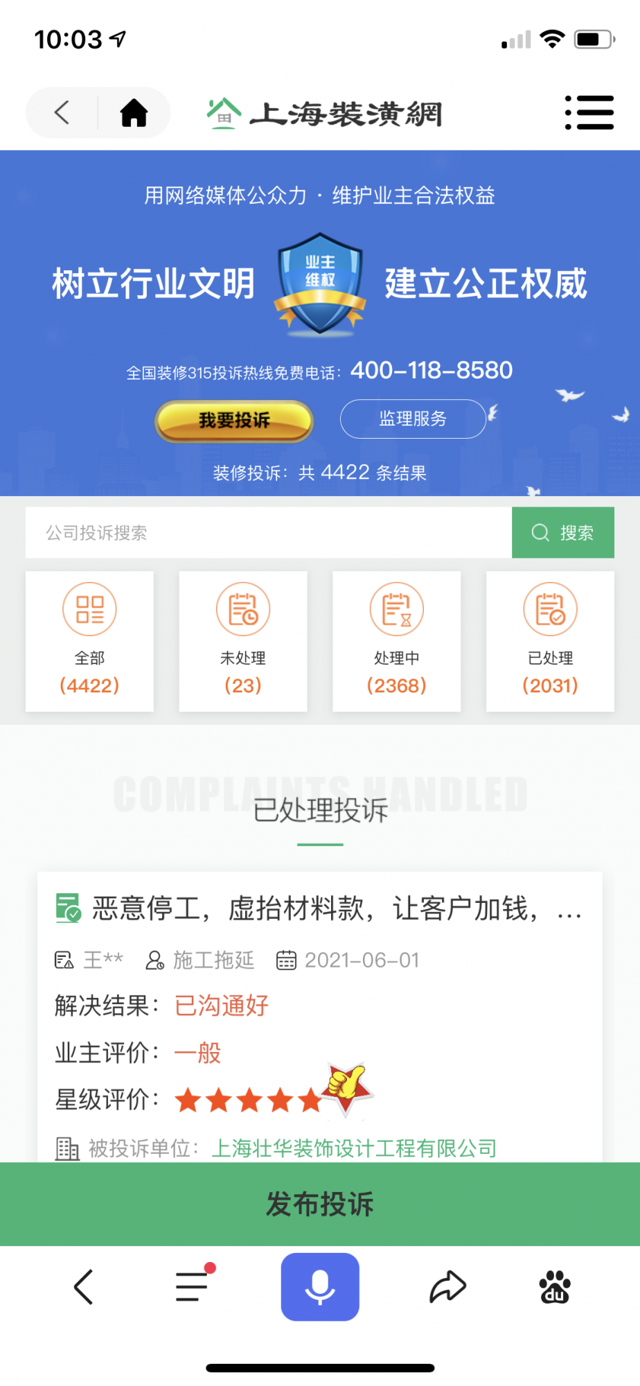 | 投訴類型 | 施工拖延 | 投訴人 | 鐘** | 被投訴單位 | 上海信君裝飾工程有限公司 |