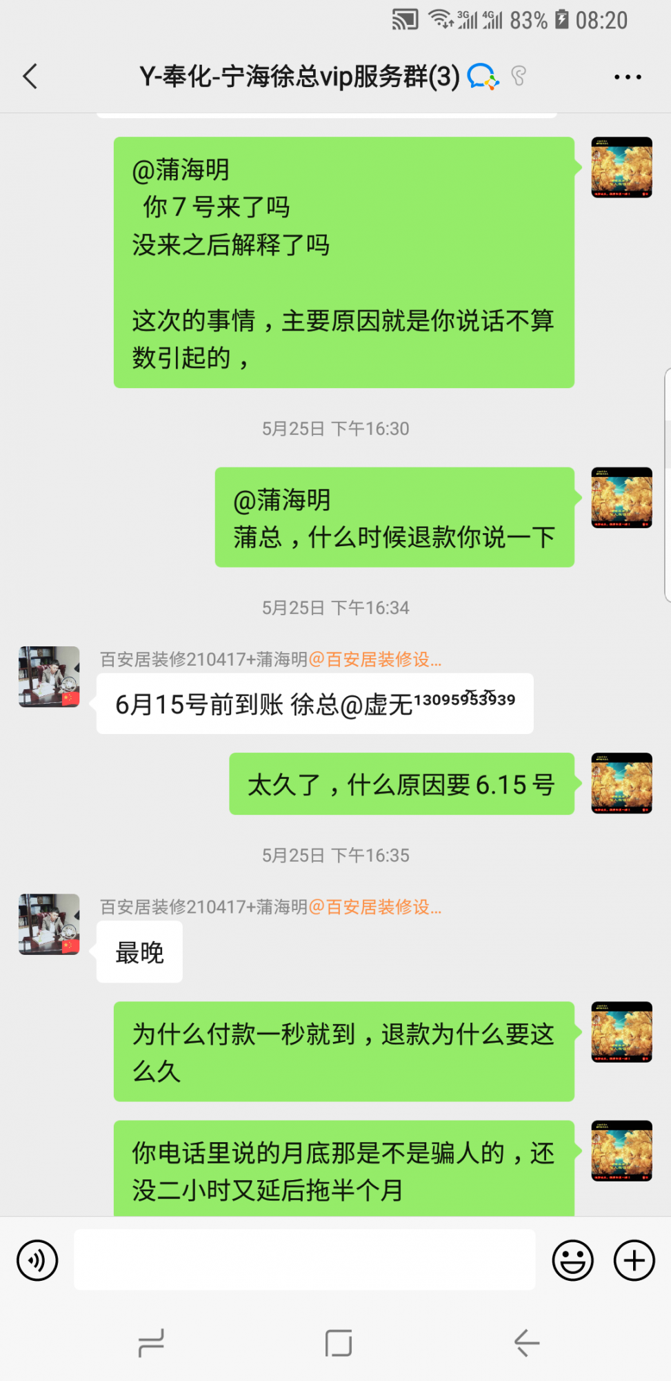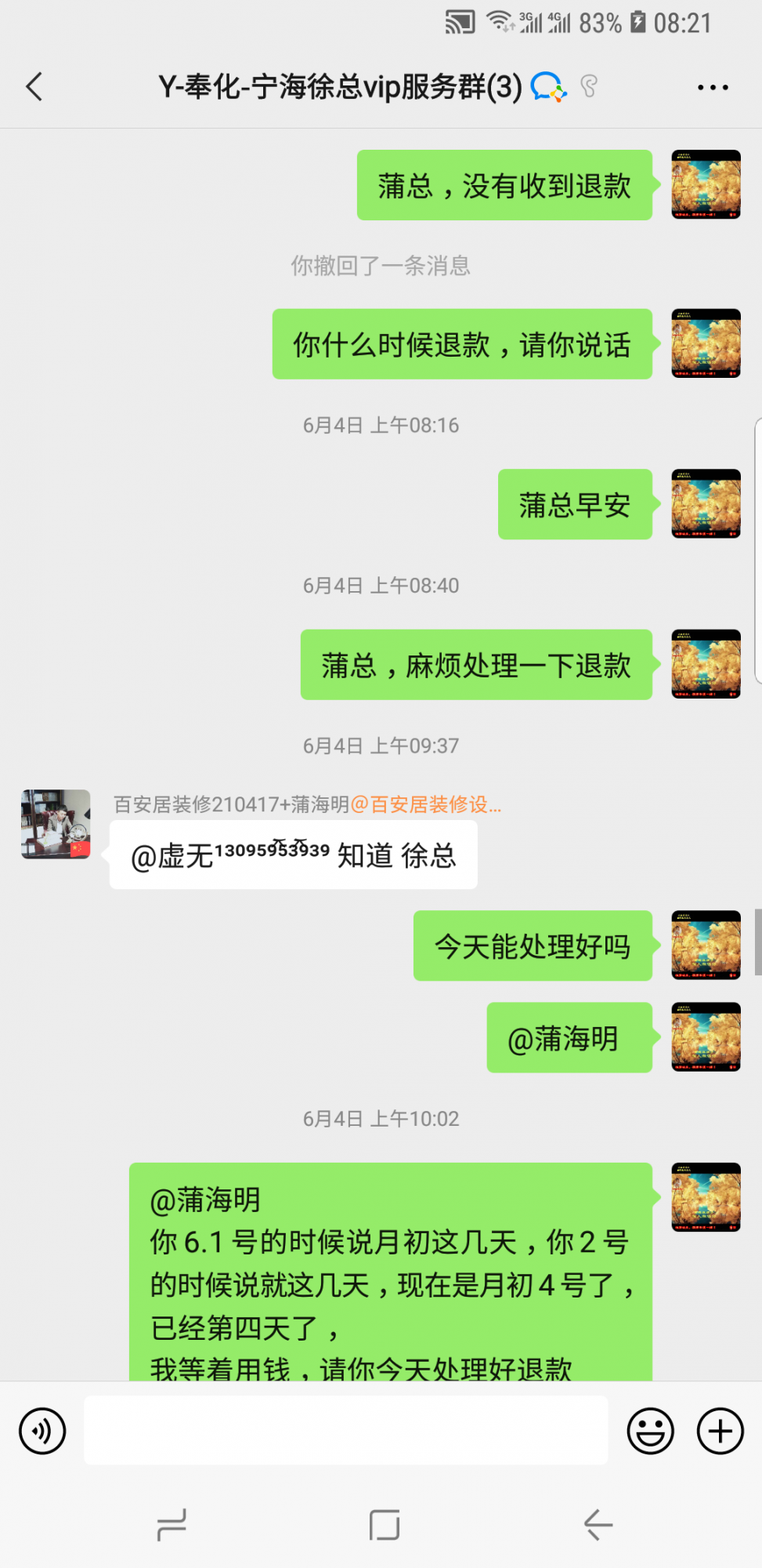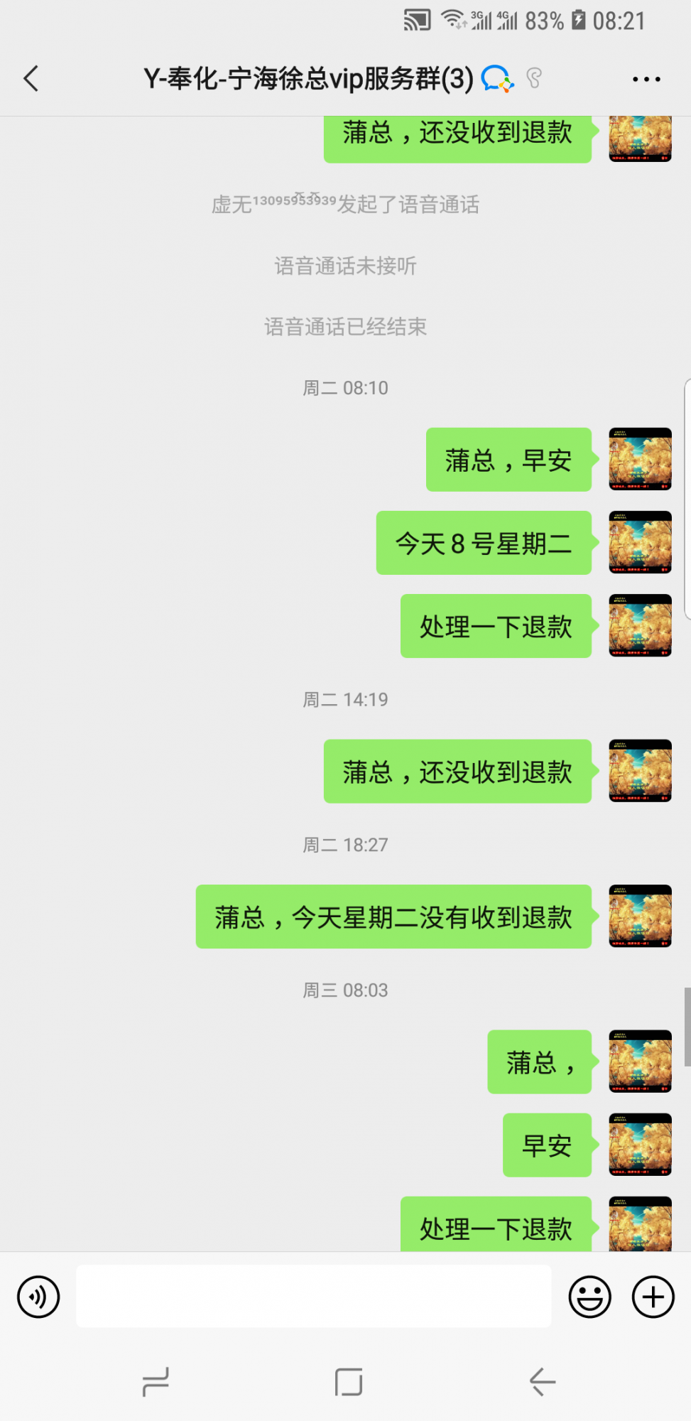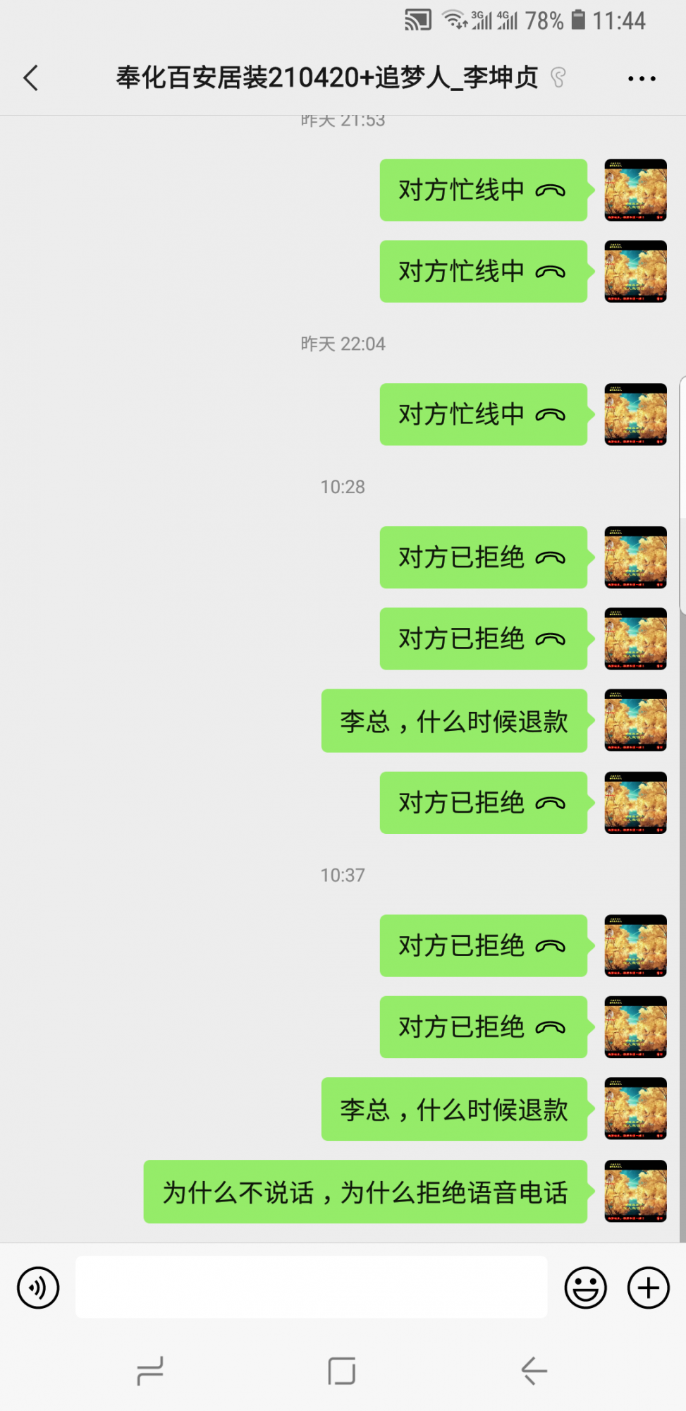今天6.11號(hào),微信問負(fù)責(zé)人李坤貞什么時(shí)候退款,微信電話給他,都被拒絕!