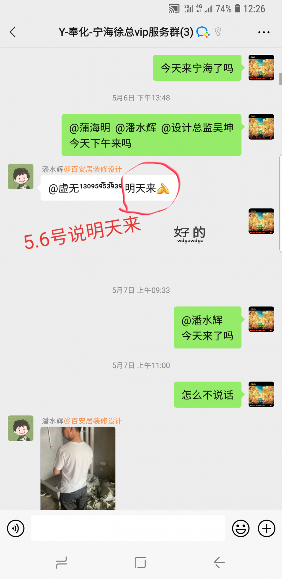 4.23號(hào)他們收到錢后一直不來寧海干活,在5.6號(hào)的時(shí)候,潘水輝說5.7號(hào)來寧海,