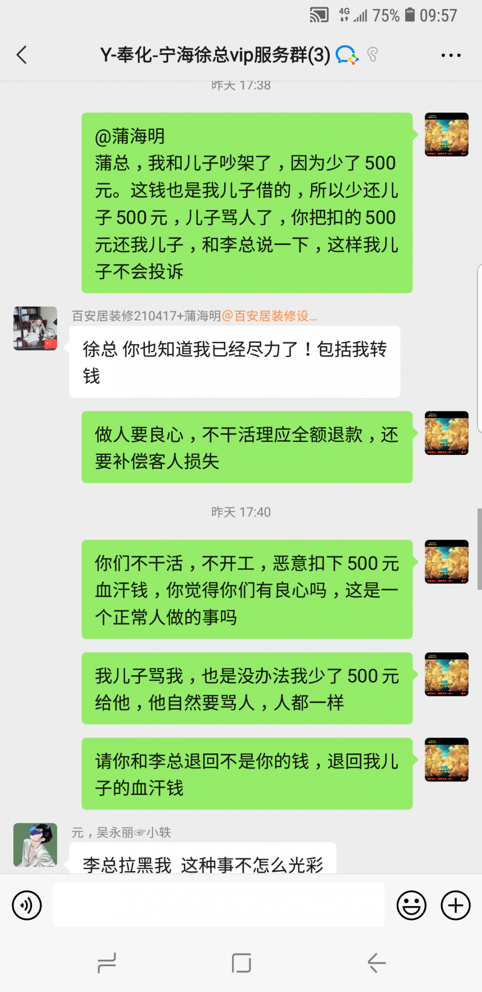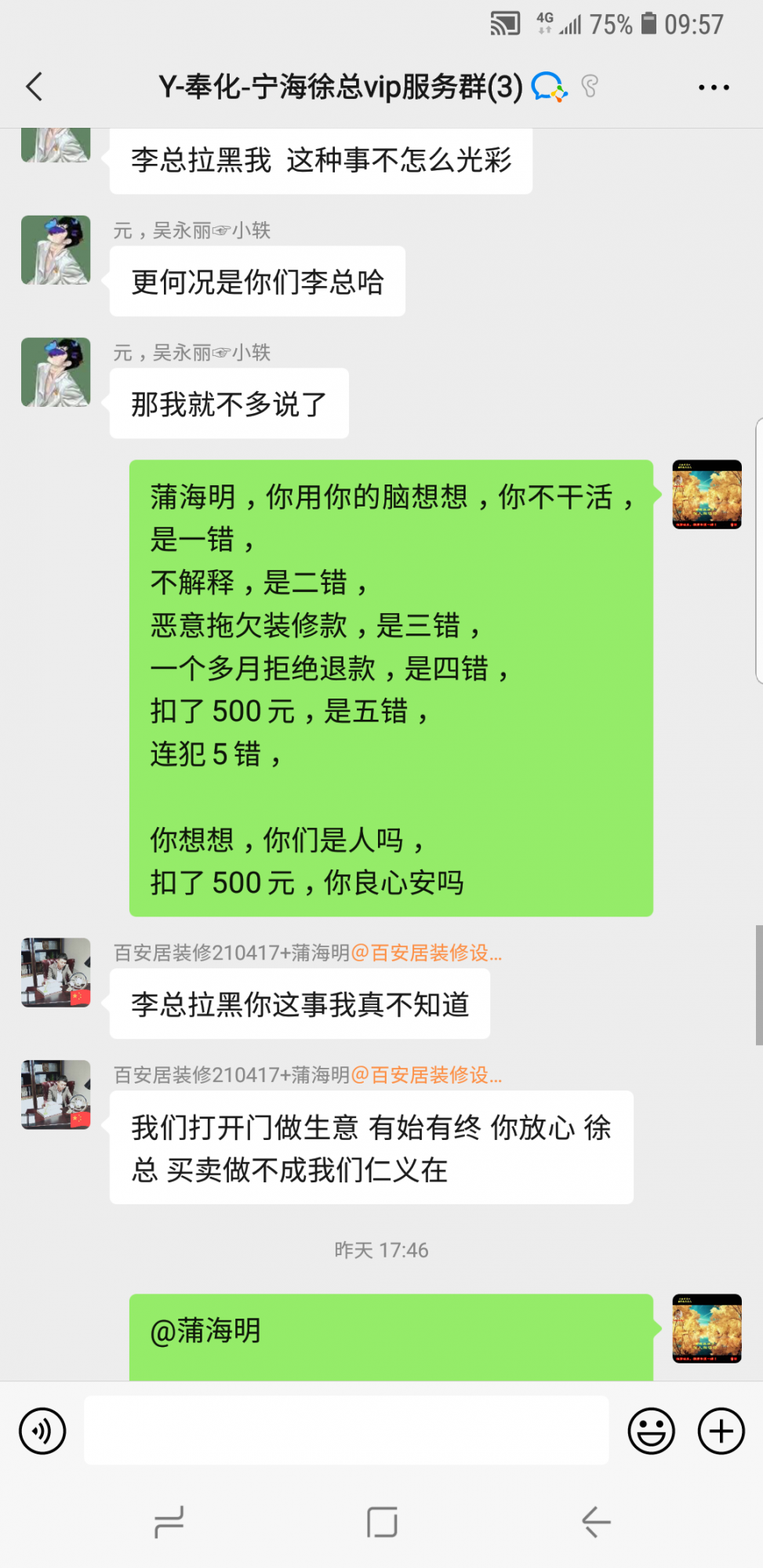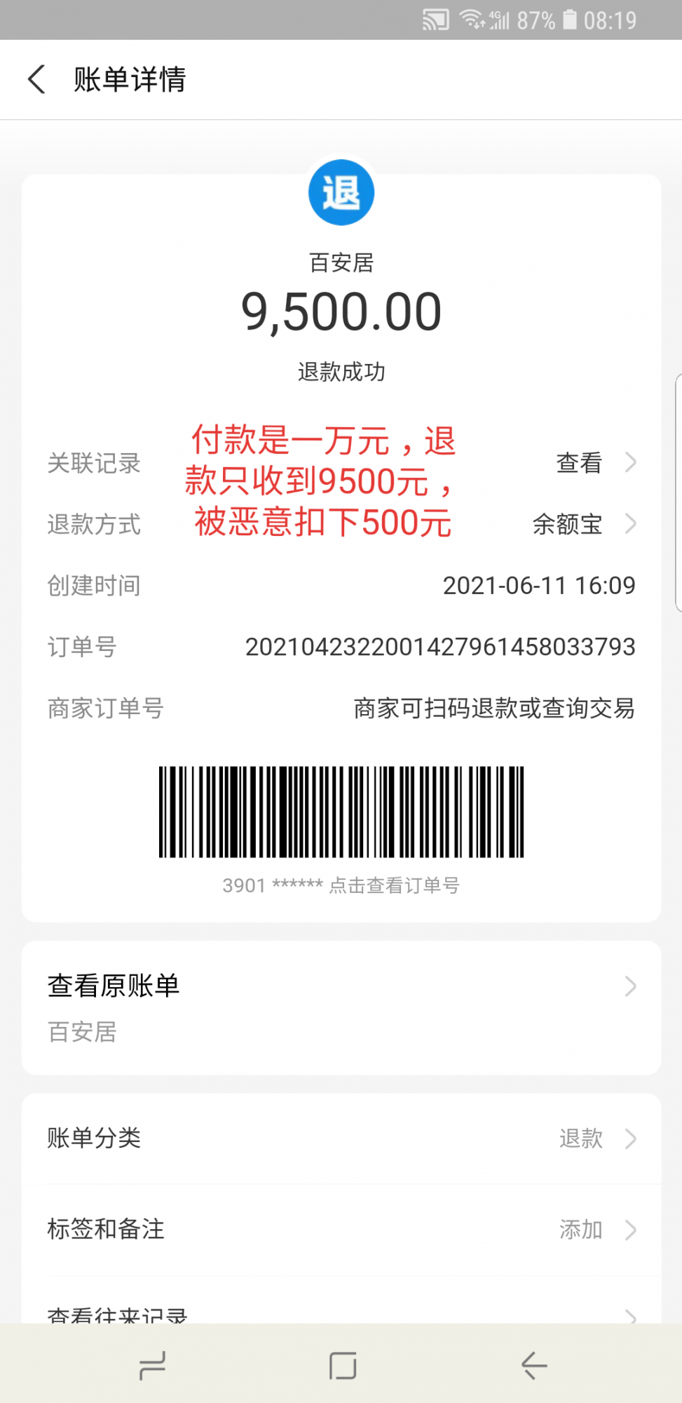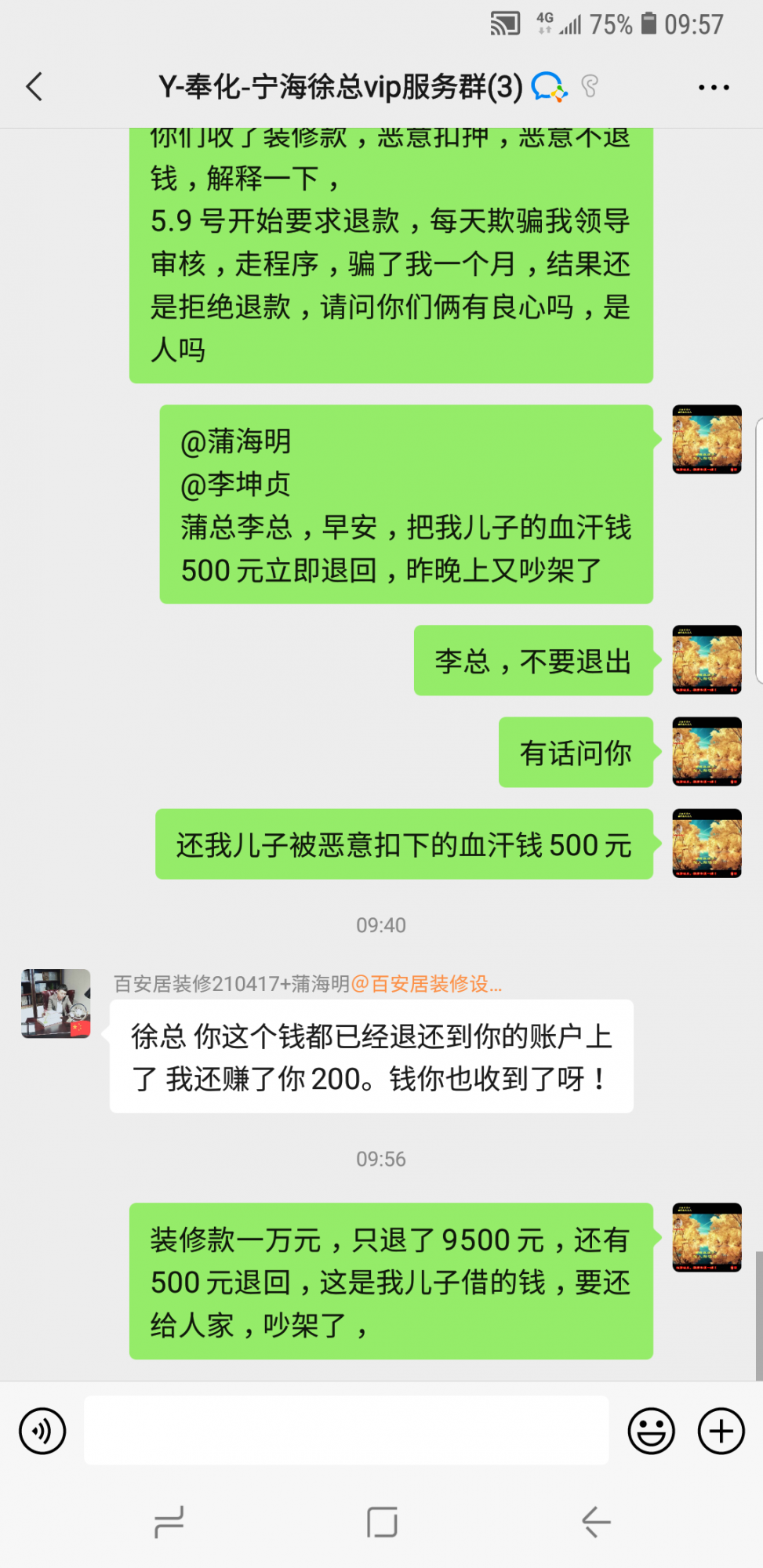 在萬(wàn)般無(wú)奈的情況下,我用本平臺(tái)選擇投訴舉報(bào)百安居,要求退款,昨天已收到9500+200,共收9700元,惡意扣下我500元不退,請(qǐng)問(wèn)為什么要扣我500元?不施工不干活,拒絕退款,這不是詐騙是什么?這和偷盜搶有何何異?。?