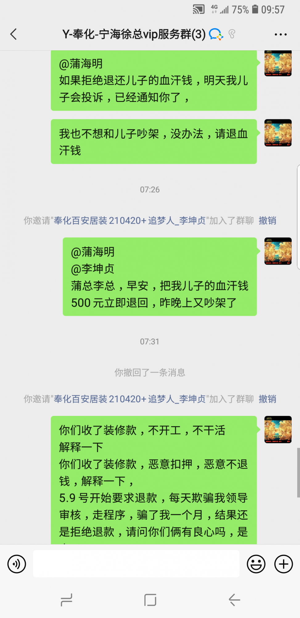 在寧海4.21付款200元,在奉化4.23付款10000元,付款后,一直不干活不開工,我在無(wú)奈的情況下,5.9號(hào)晚上要求退款?。?