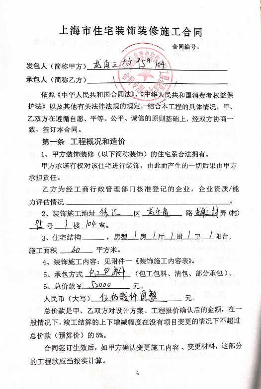合同裝飾地址為上海市徐匯區(qū)龍水南路龍南三村95號104室內(nèi),合同金額總價52000元。合同約定開工日期2021年4月16日,竣工日期2021年6月16日。至今日2021年6月27日,現(xiàn)場水電未完成,隱蔽驗(yàn)收未做。近一個月來裝修公司已不安排施工人員來現(xiàn)場施工。根據(jù)合同已支付了第一筆費(fèi)用15600元,我方通知施工隊(duì)如不繼續(xù)施工,盡快根據(jù)已完成內(nèi)容結(jié)算,我方需要另請其他公司繼續(xù)后續(xù)裝修盡快入住。裝修公司一直拖延不解決問題。