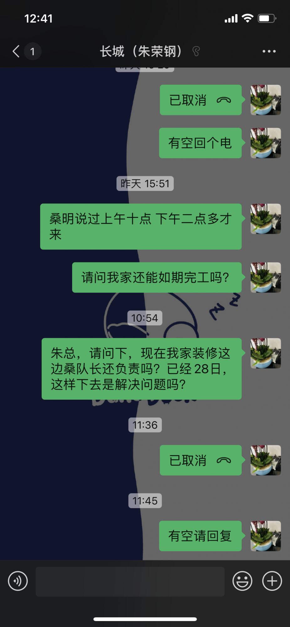 目前為止隊(duì)長(zhǎng)桑隊(duì)不回復(fù)客戶信息,不安排工人來作業(yè)。負(fù)責(zé)人朱總承諾業(yè)主六月份月底能完工,目前也不回復(fù)消息不處理問題